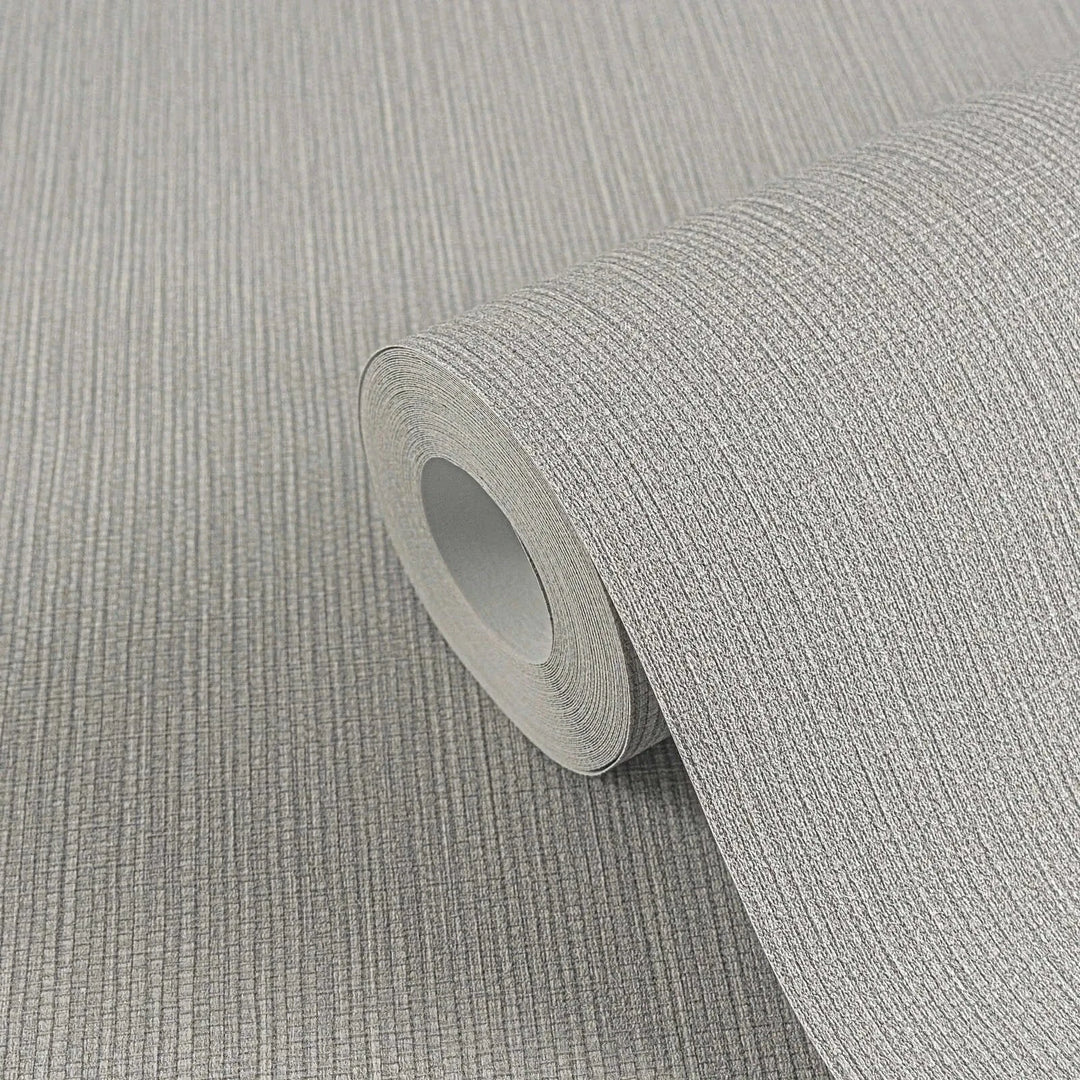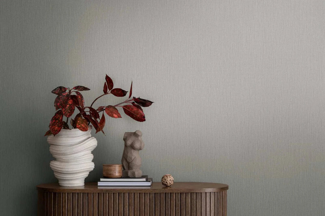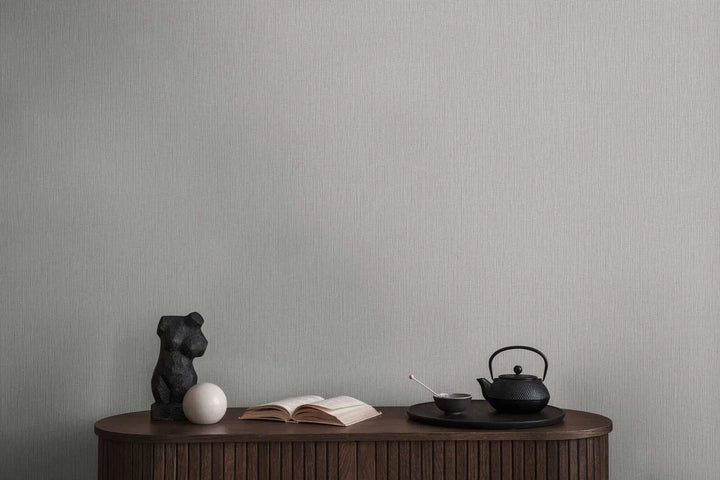 Tumši pelēkās flizelīna tapetes ar auduma struktūru piešķir telpai eleganci un vizuālu dziļumu.