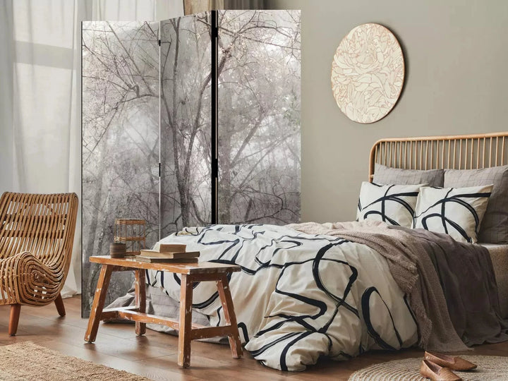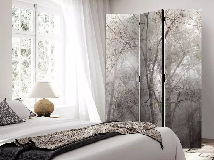 Aizslietnis ar meža skatu pelēkos toņos un vintāžā stilā.