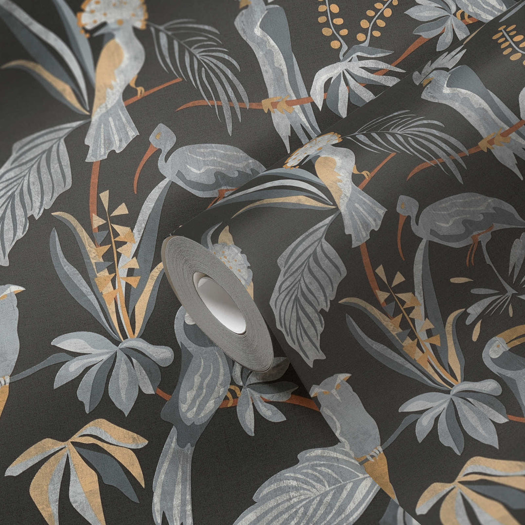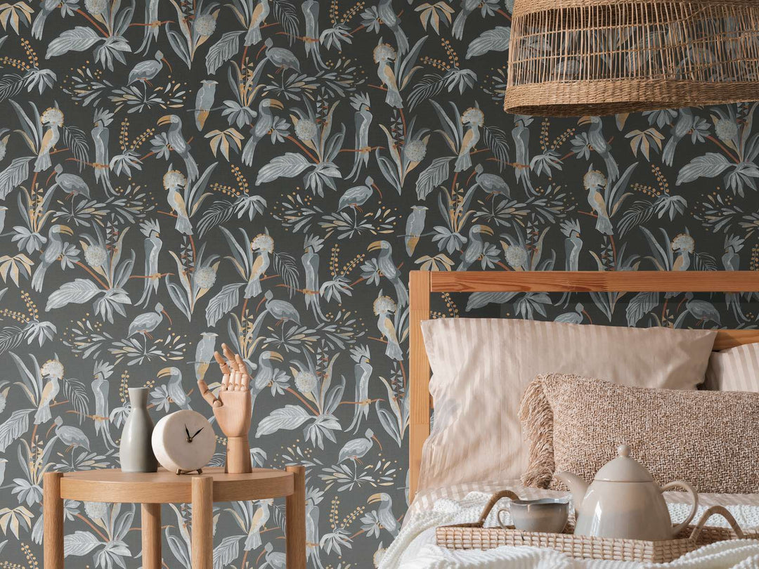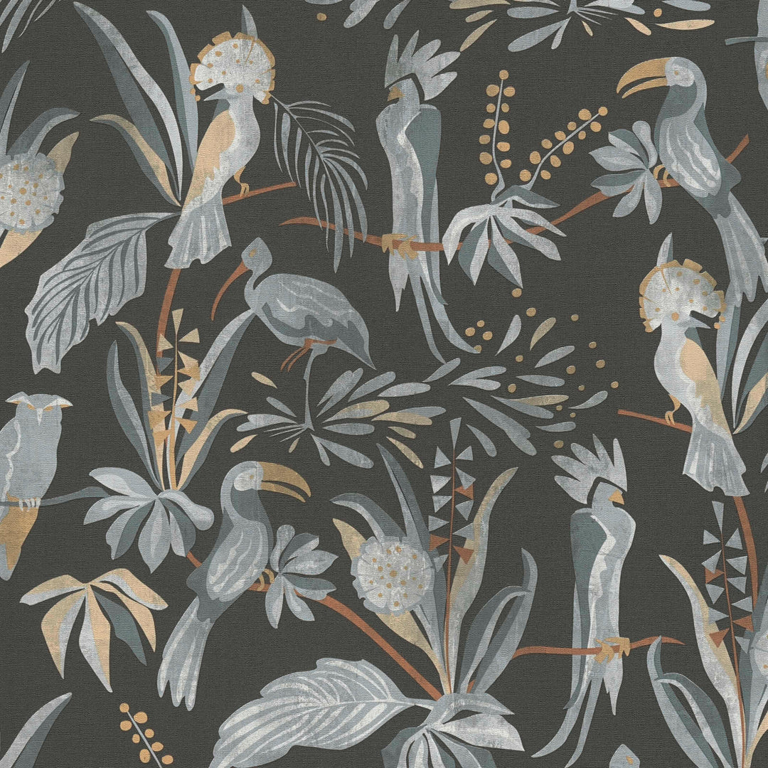 Tapetes ar tropu augiem un putniem, lina izskats: melnā, pelēkā, 1367566