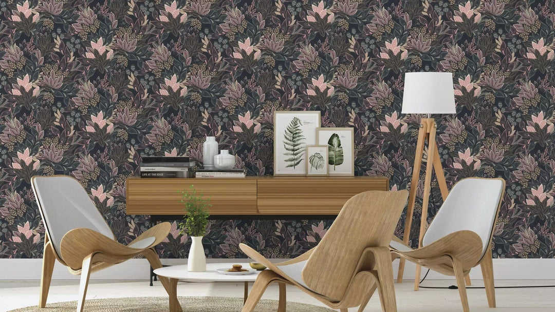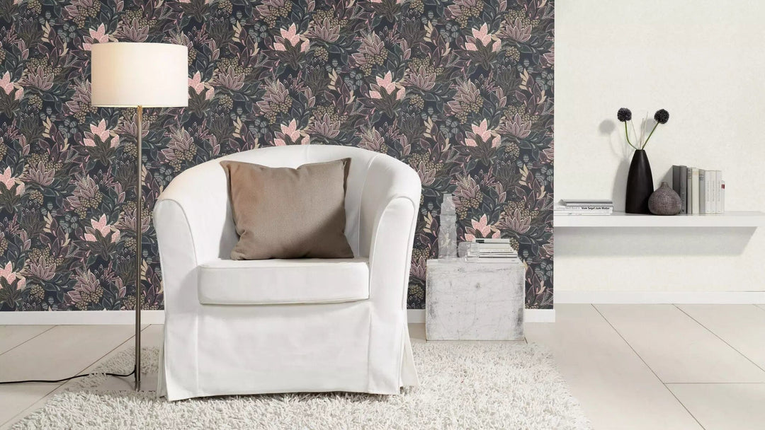 Virpulis ir pagriezies, jo tagad mājās kļūst patiešām omulīgi. Dažādas izdomas pilnas lapas ir dekoratīvi iestādītas pie sienas un piešķir dzīvīgu un rotaļīgu noskaņu. Augi zili pelēkā, bēšā, riekstu un šokolādes brūnā krāsā ir izkliedēti uz balta fona ar smalku faktūru. Tādējādi mājās acumirklī tiek radīta patīkama atmosfēra.
