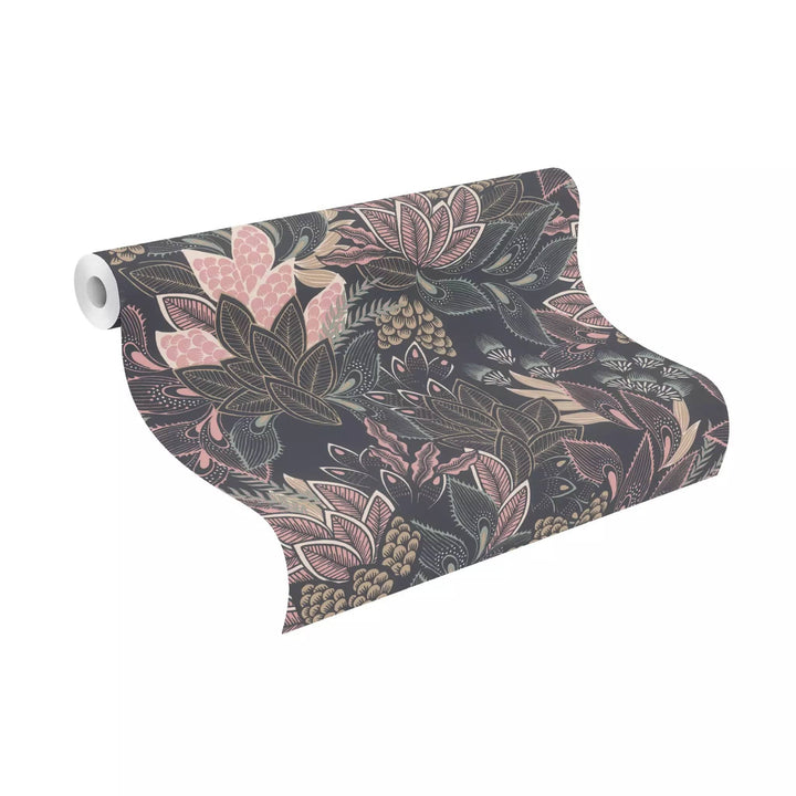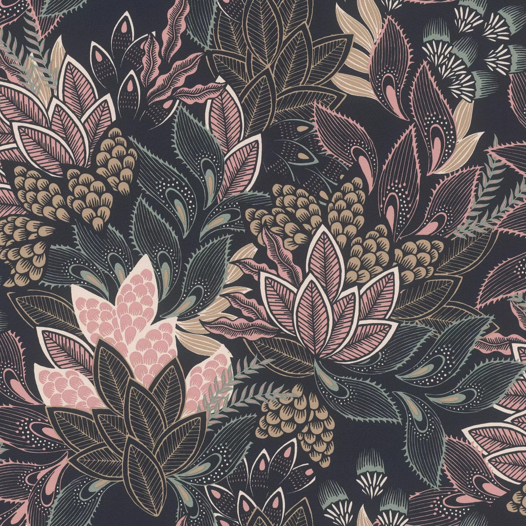 Tapetes RASCH lauku stilā ar dekoratīvām lapām uz tumša fona, 3233707
