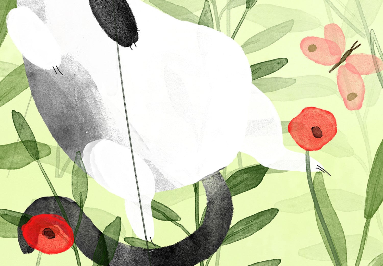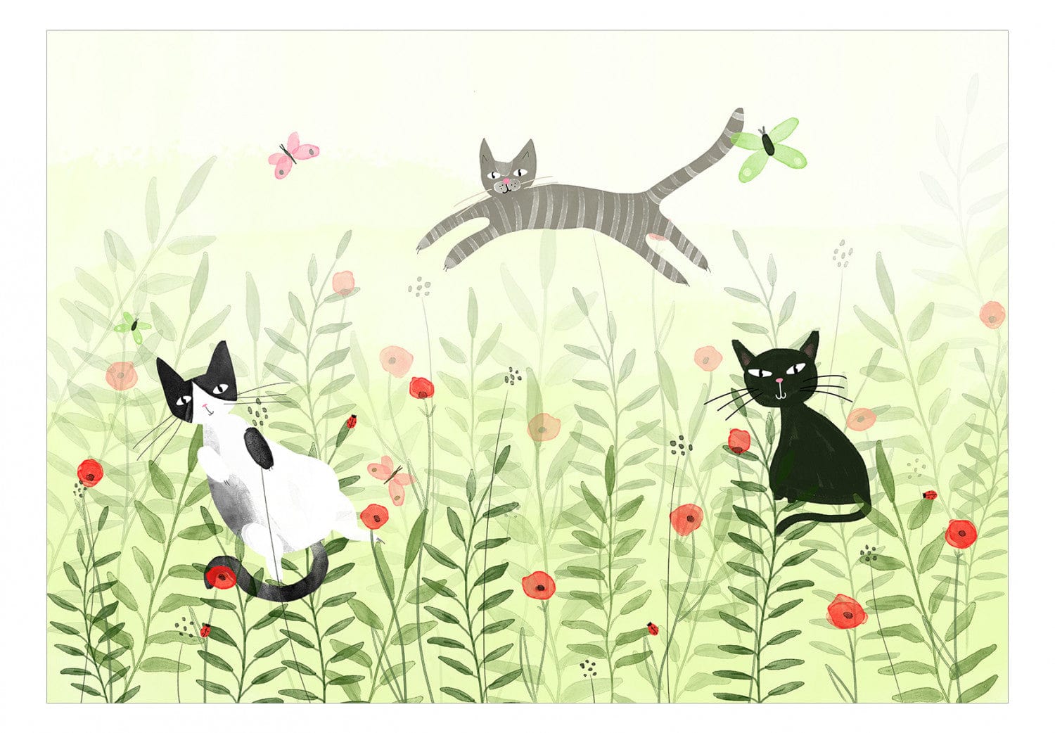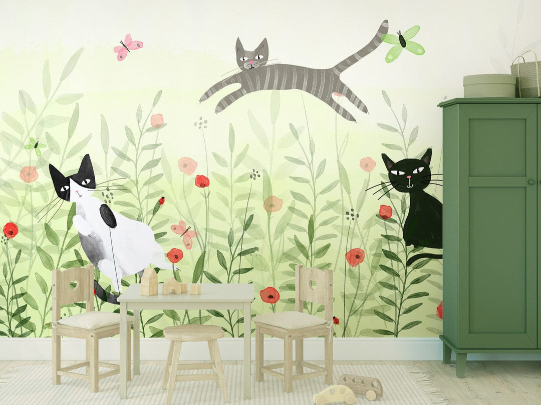 Fototapetes bērnistabai zaļos toņos - Kaķi pļavā ar tauriņiem - 142683