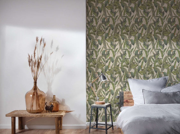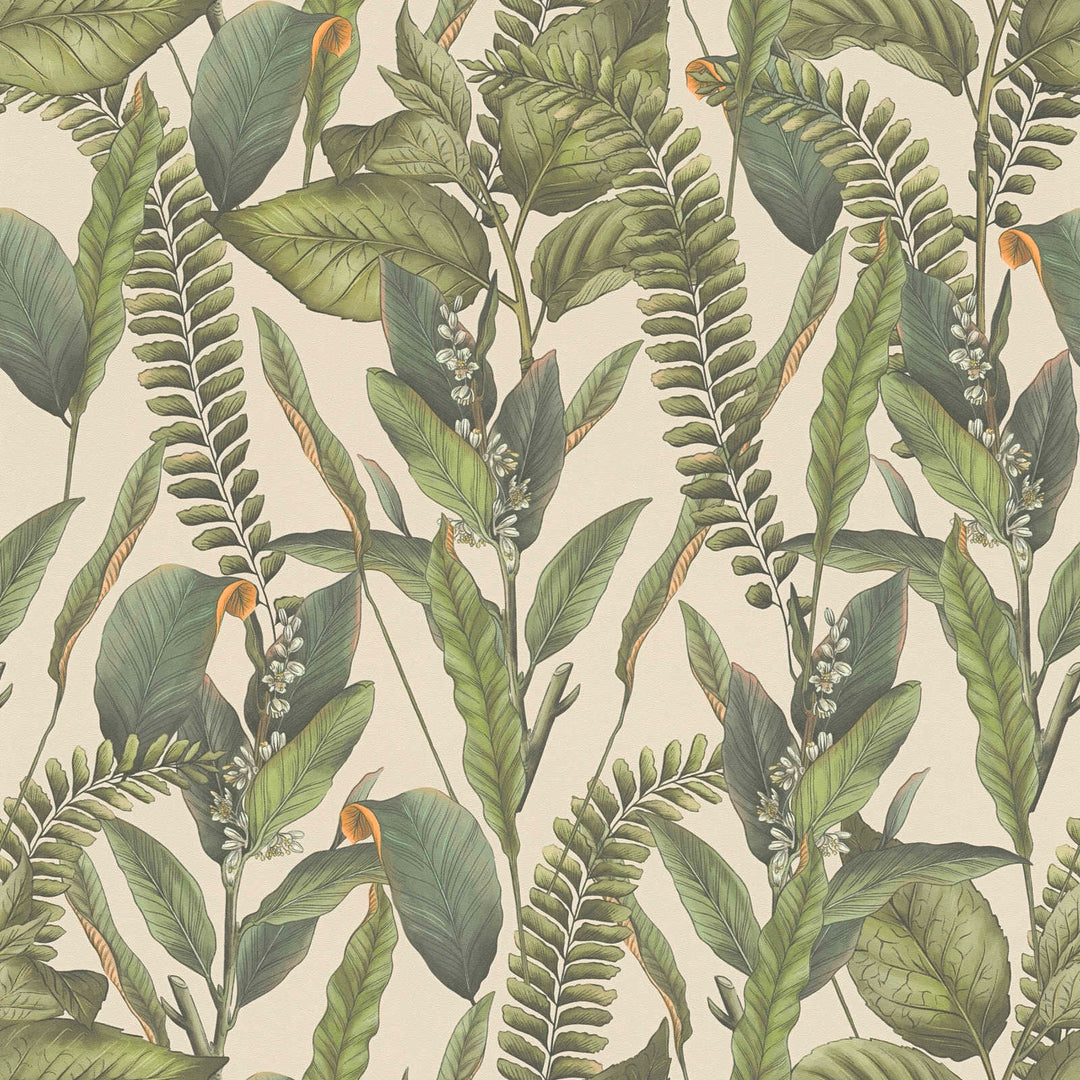 Džungļu tapetes ar lapām un ziediem, matētas: zaļā un krēmkrāsā, 1401624