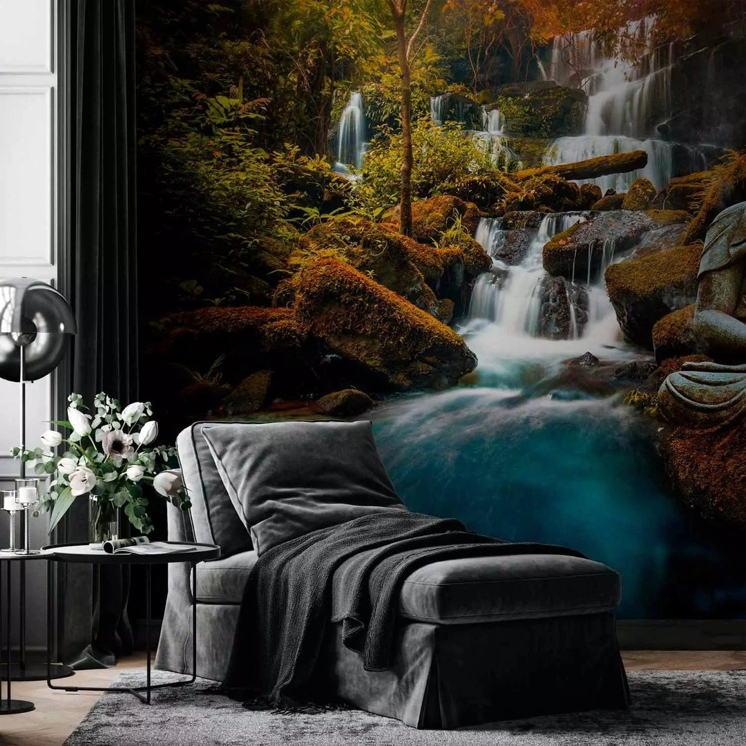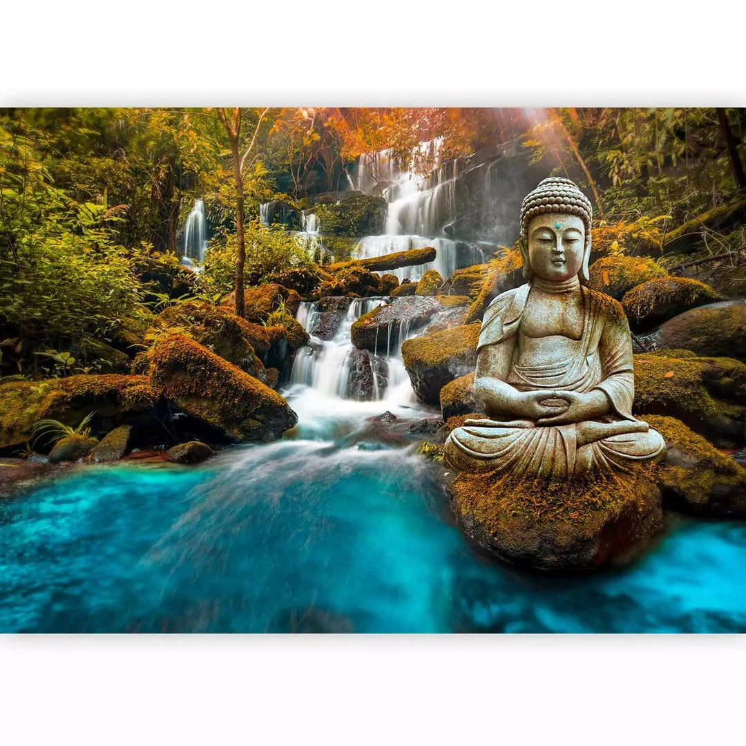 Fototapetes - ainava ar Budas skulptūru uz ūdenskrituma fona, 90010