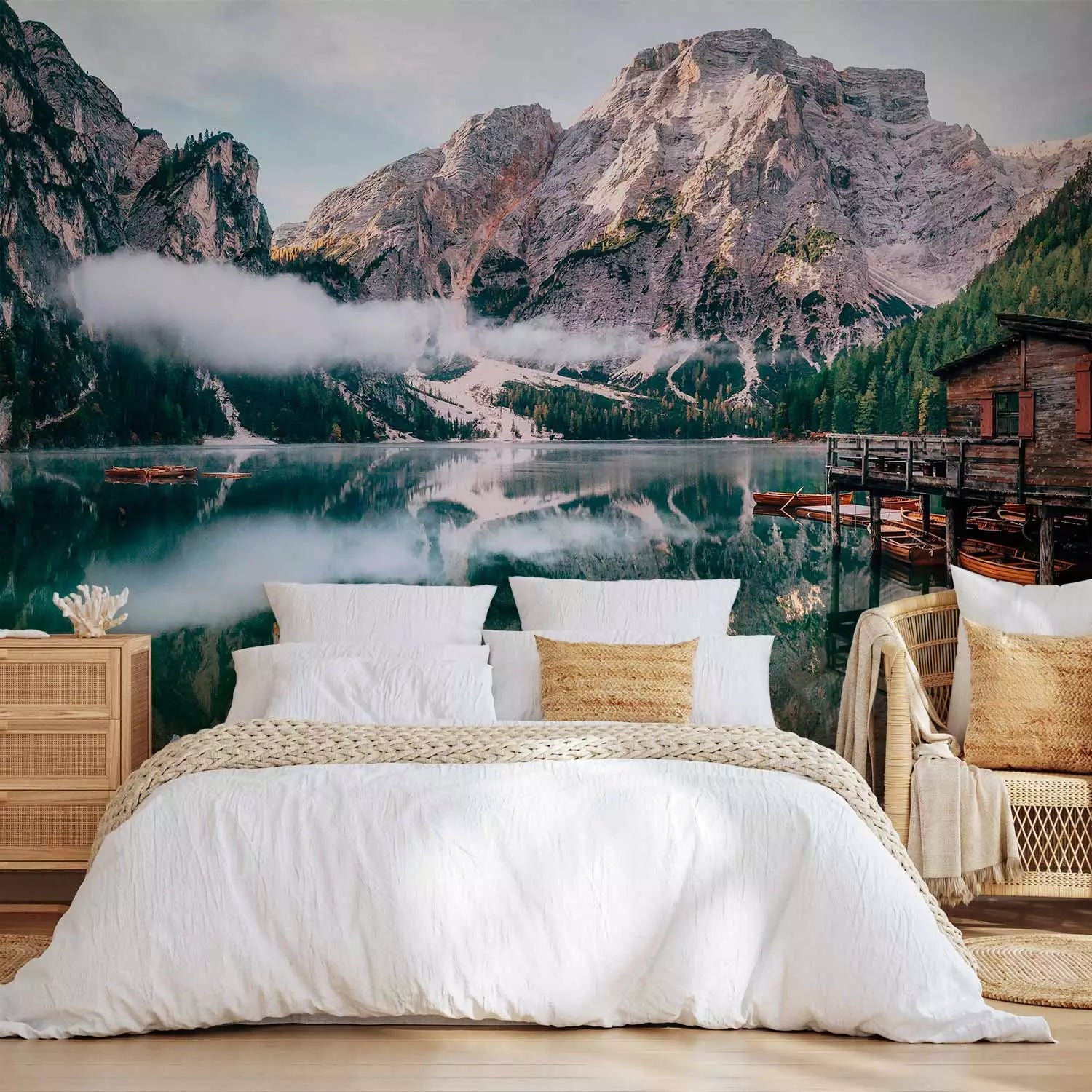 Fototapetes - Ainava ar koka māju un laivām uz kalnu fona, 150968
