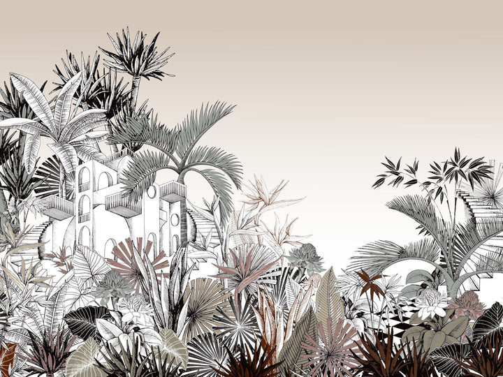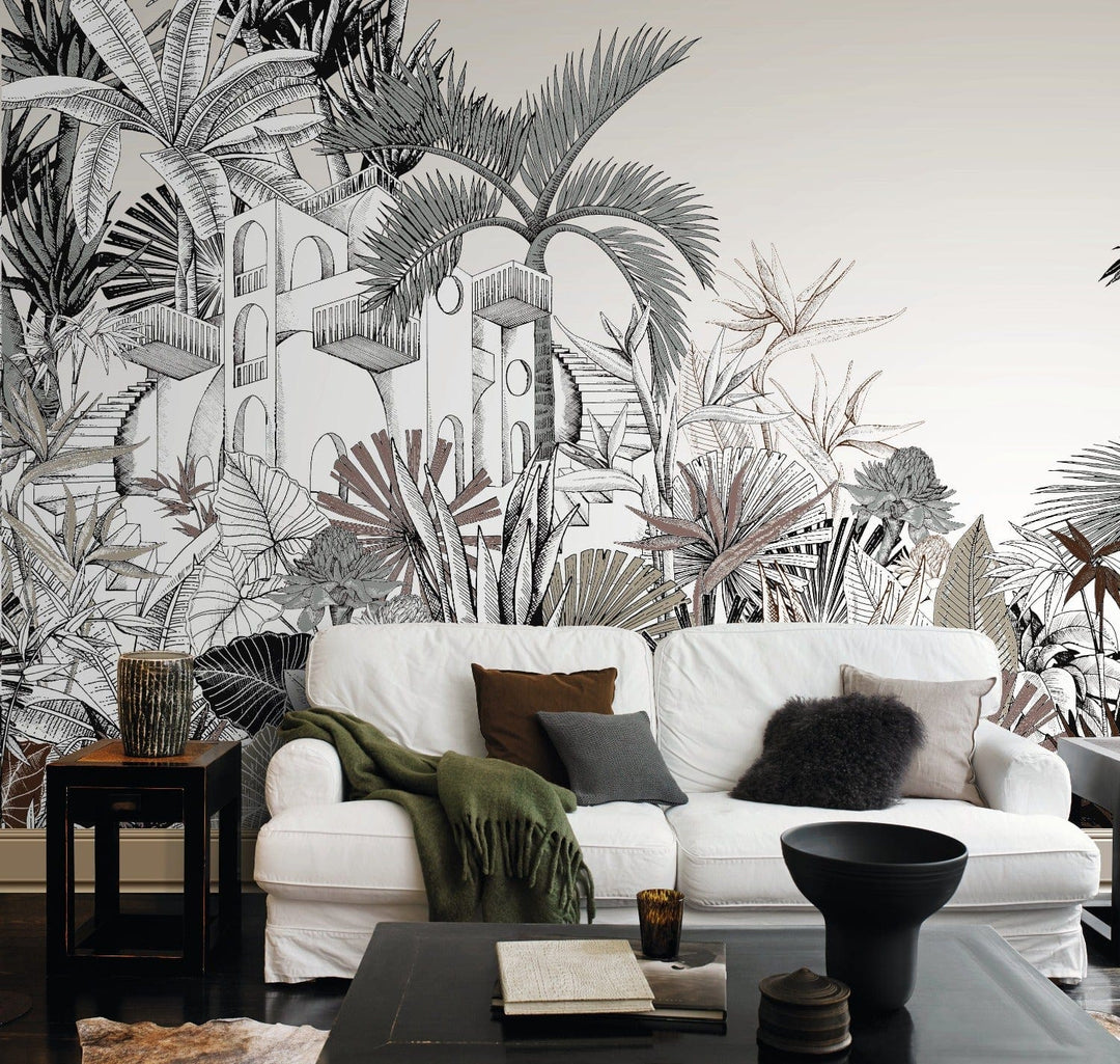 Oāze pilsētas džungļos? Voilà! Šī sienas attēla lielais formāts padara to vienkāršu. Ja telpā ir šāda akcenta siena, mazliet vairāk dekorāciju nav nepieciešams. Smalki zīmētais attēls var vienkārši pastāvēt pats par sevi. Dažādi palmu dārza augi melnā, baltā un dažādos pelēkā toņos izceļas uz spilgta fona. Zelta nokrāsa arī izgaismojas, radot visu gadu ilgu brīvdienu krāšņumu.