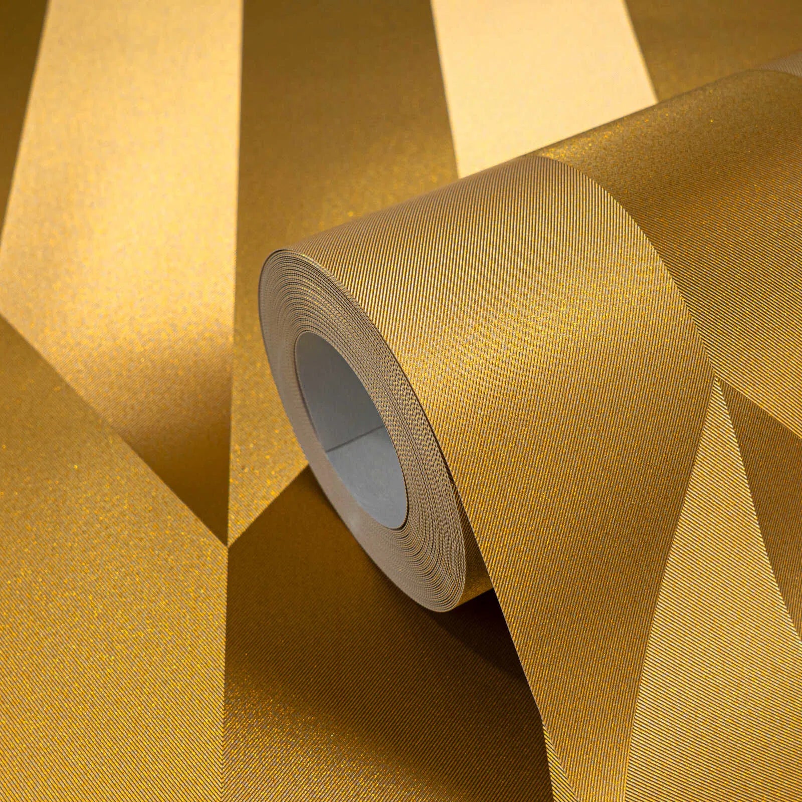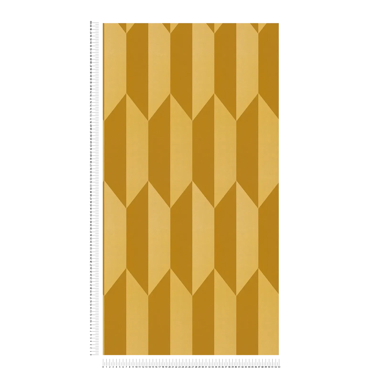 Tapetes motīvs attēlo ģeometrisku rakstu no atkārtojošiem rombiem un paralēlogrammām, kas nevainojami saskaņojas. Tas rada interesantu trīsdimensiju efektu, it kā formas izceļas spilgti no fona. Krāsu gamma raksturojas ar siltām dzeltenām un okera toņiem, kas ir harmoniski saskaņoti. Virsmām ir gaišāks un tumšāks dzeltenokrāsas okers, kas pastiprina grafisko, gandrīz retro rakstu. Tapetes rada draudzīgu, dzīvīgu efektu un telpā veido siltu, aicinošu atmosfēru. Simetrija un skaidras līnijas rada modernu, grafisku stilu ar vintage pieskaņu, kas atgādina vidusgadsimta dizainu.