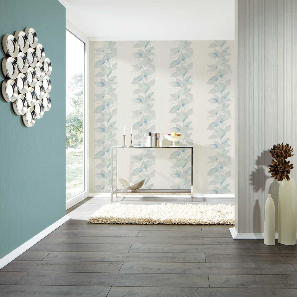 Tapetes ar dažādām lapām: zaļa, krēma, tirkīza, 393484 AS Creation