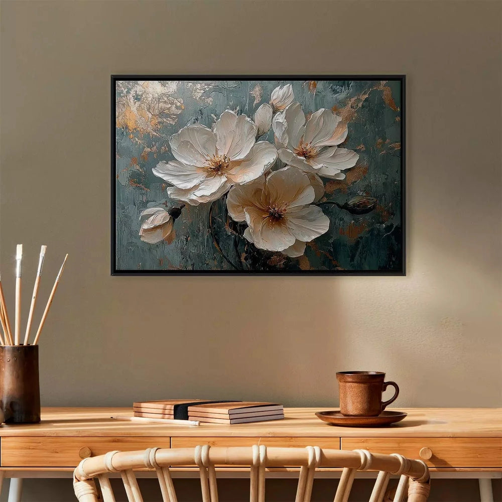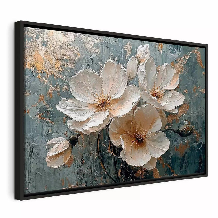 Glezna melnā koka rāmī - balti ziedi uz zila un zelta fona, 162002