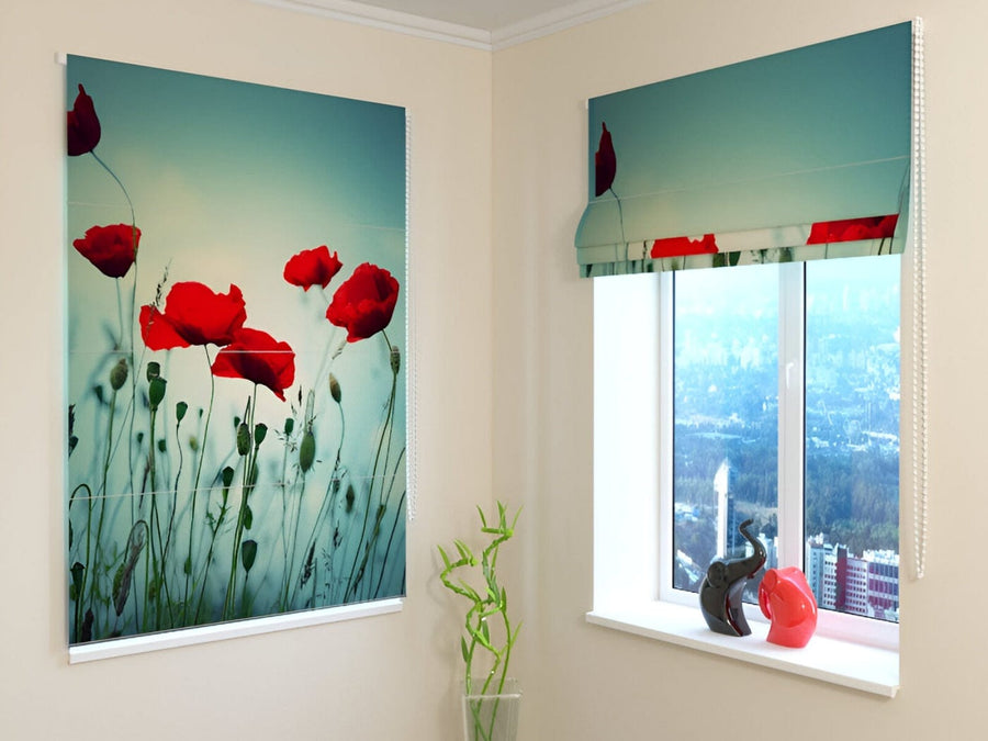 Žalūzijas ar magonēm - Sarkanas magones un zila fona