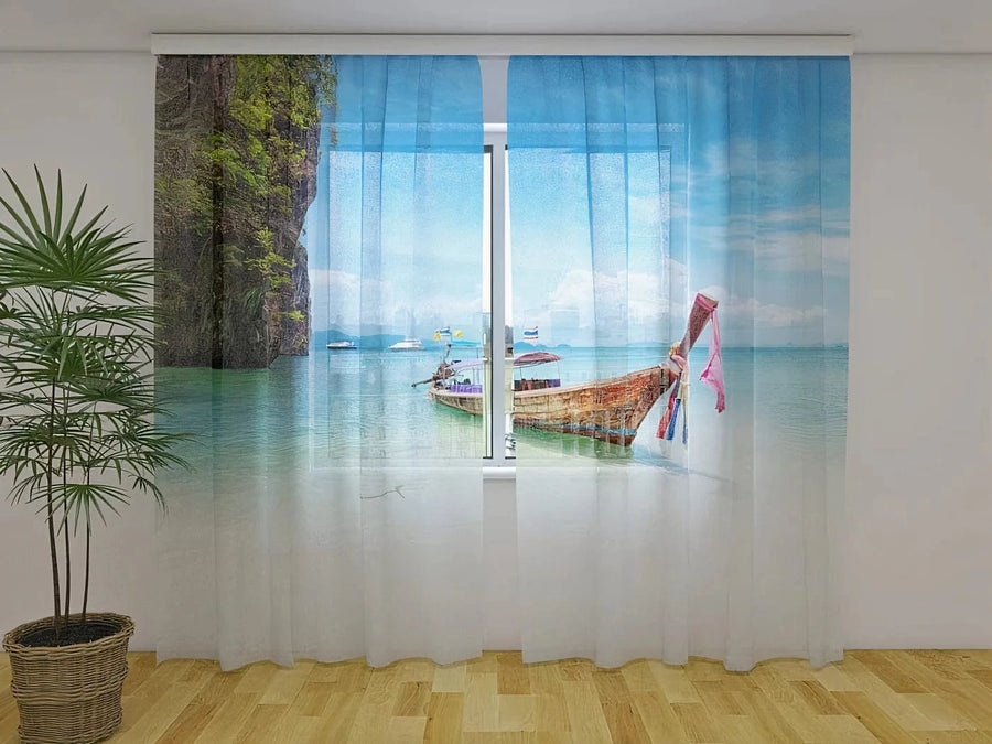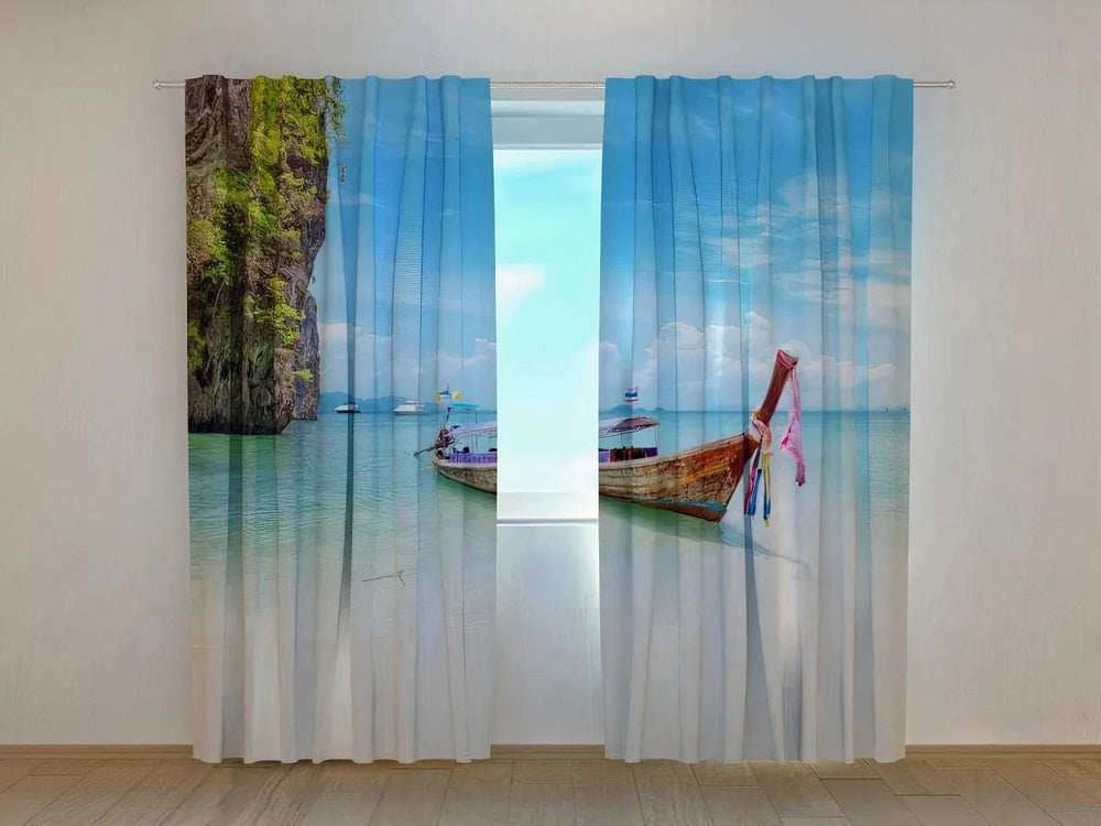 Aizkari ar tropisko skatu - laiva uz Taizemes pludmales - zilos toņos Tapetenshop.lv