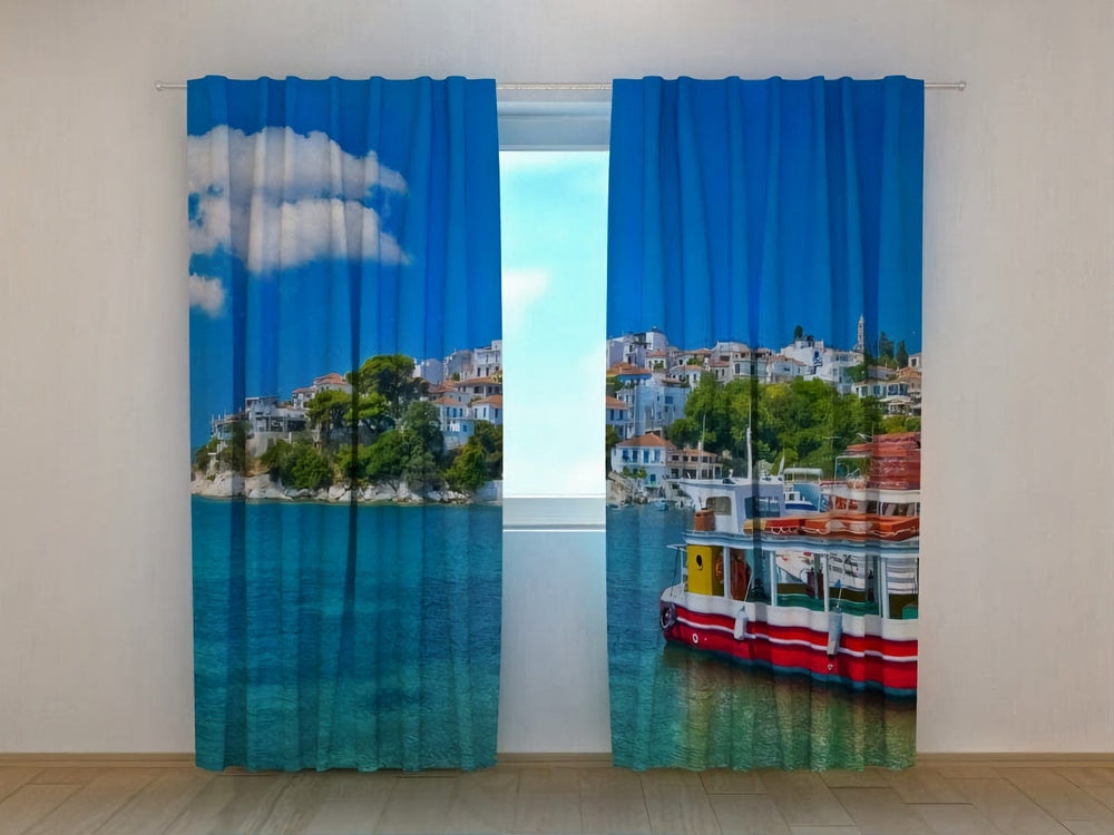 Dekoratīvi aizkari ar apdruku - Grieķijas piekrastē - pasūtīt Tapetenshop.lv