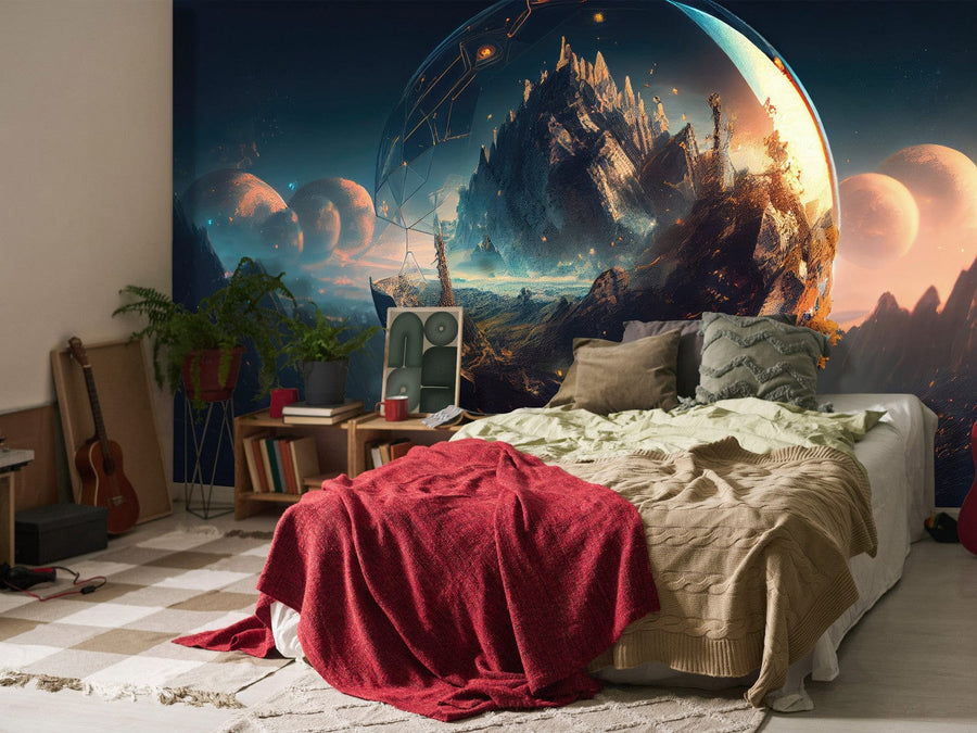 Fototapetes jauniešiem - Kalnu ainava stikla lodē ar planētām G-ART