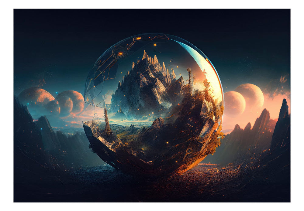 Fototapetes - Kalnu ainava stikla lodē ar planētām, 150679