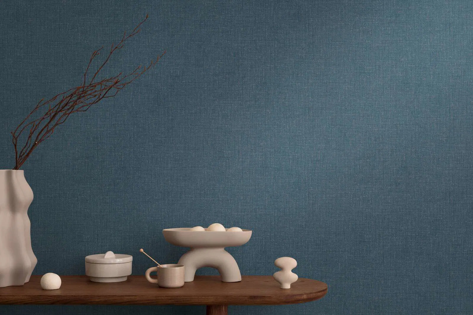 Tapetes raksts ir ar teksturētu virsmu, kas atgādina austos audumus, piemēram, linu vai rupju kanvasu. Smalkas, neregulāras līnijas un pavedieni vijās cauri visam dizainam, piešķirot tam smalku, dabisku tekstūru ar maigu vintage raksturu. Pamata krāsa ir bagātīga, klusa zila, kas nedaudz tendē uz benzīna krāsu un rada mierīgu, patīkamu telpisko efektu. Izkaisīti smalkie akcenti gaišākos un tumšākos zilo toņos, kā arī atsevišķas brūnganas un pelēkas nianses pastiprina materiāla izskatu un rada dziļumu. Stils ir skaidrs, laikmetīgs un neuzbāzīgs, padarot šīs tapetes universālas, piemēram, modernos, skandināvu vai urbānos interjeros. Krāsu gamma rada nomierinošu, mājīgu efektu un izstaro atturīgu eleganci.