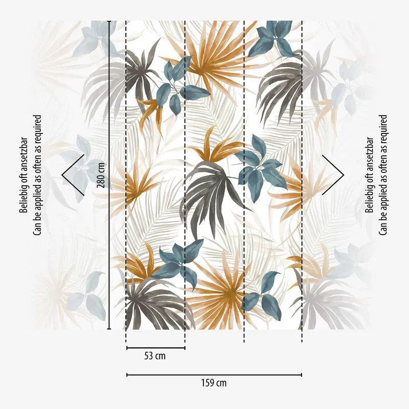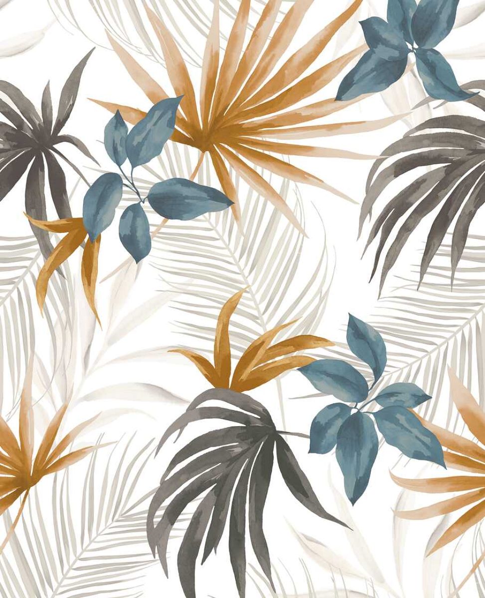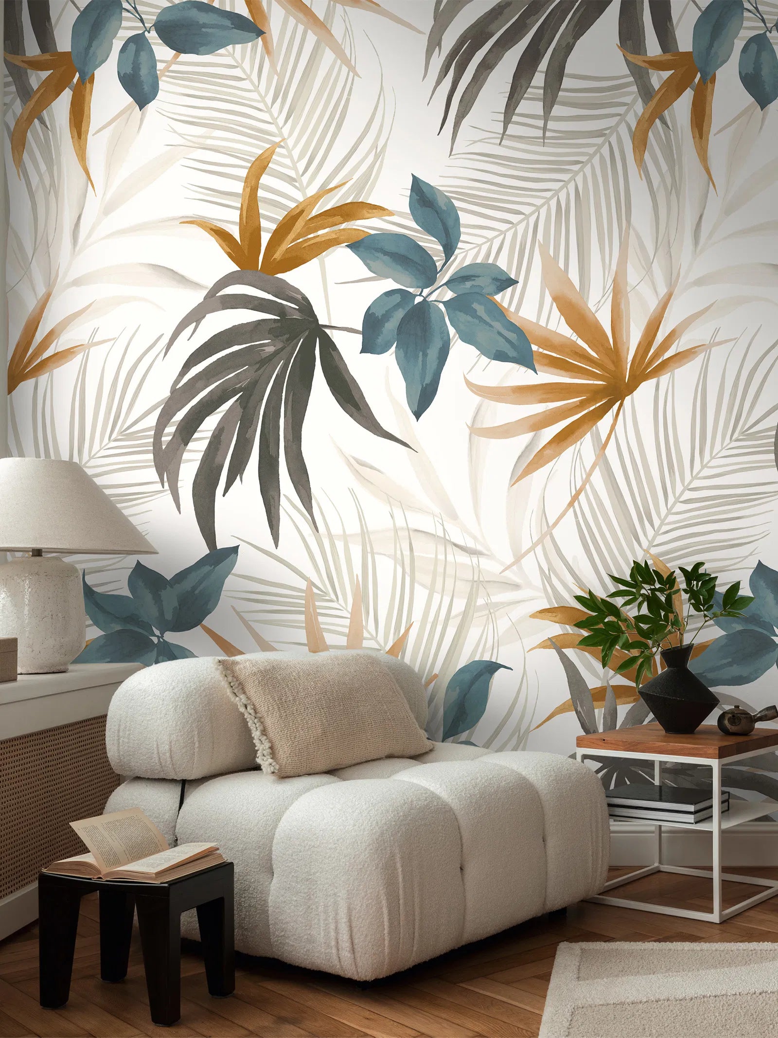 Tapetes raksts ir bagātīgs, tropu lapu dizains, ko raksturo brīvi uzgleznotas palmu un papardes lapas. Krāsu gamma sastāv no zemes toņiem, piemēram, siltā okera un maigā brūnā, kas kontrastē ar vēsajiem, klusinātajiem zilo toņiem. Fona krāsā ir saskatāmas smalkas, gandrīz caurspīdīgas lapas smilškrāsas un krēmkrāsas toņos, kas kompozīcijai piešķir dziļumu un vieglumu. Lapas ir stilizētas un izskatās maigas un organiski pateicoties to brīvajam, akvareļveida dizainam. Siltu un vēsu krāsu mijiedarbība rada harmonisku, relaksētu atmosfēru ar elegances un modernitātes pieskārienu. Raksts ir dinamisks, bet ne pārblīvēts, padarot tapetes ideālas modernām dzīvojamām telpām, kurām vēlas piešķirt tropu iedvesmotu, bet stilīgu un mierīgu pieskārienu.