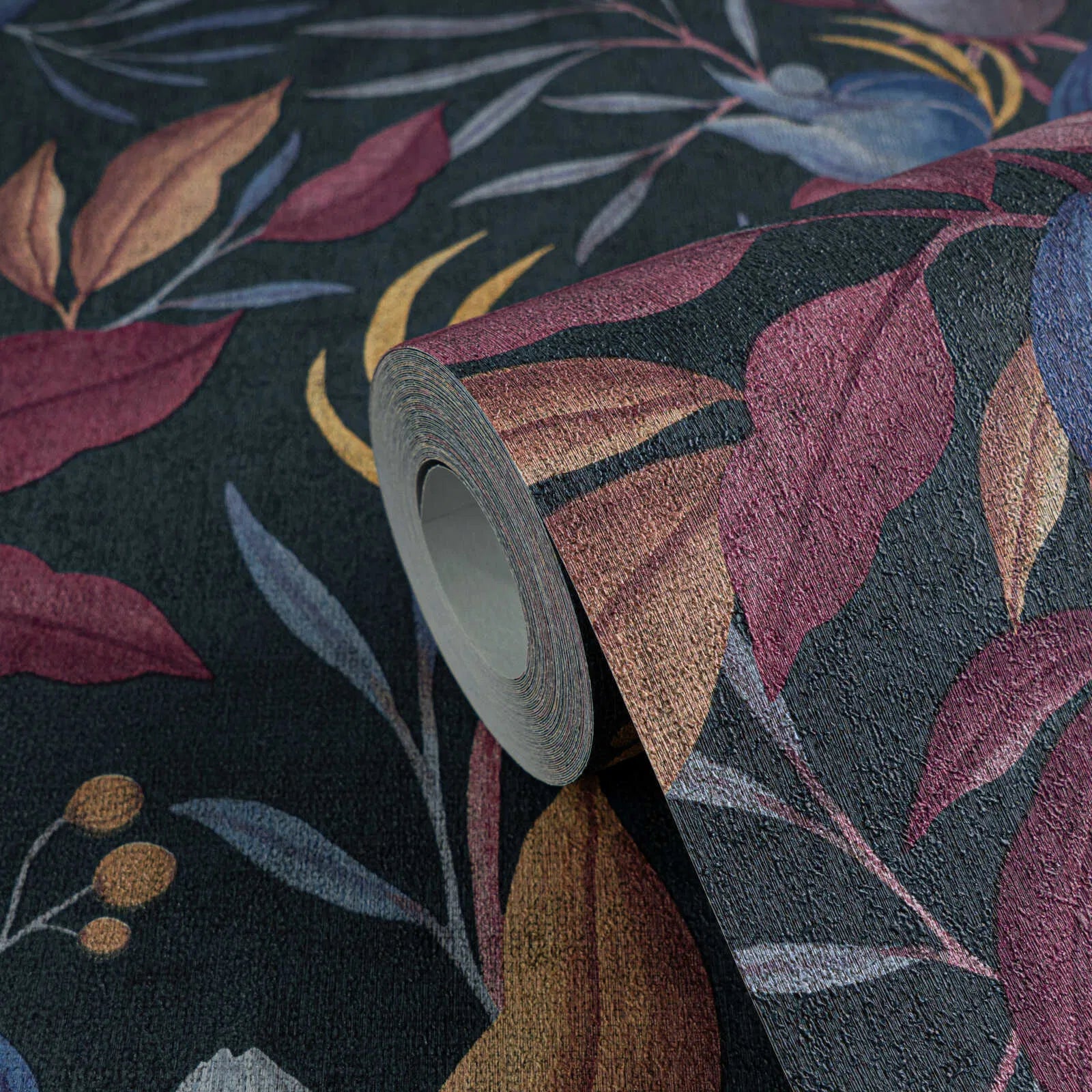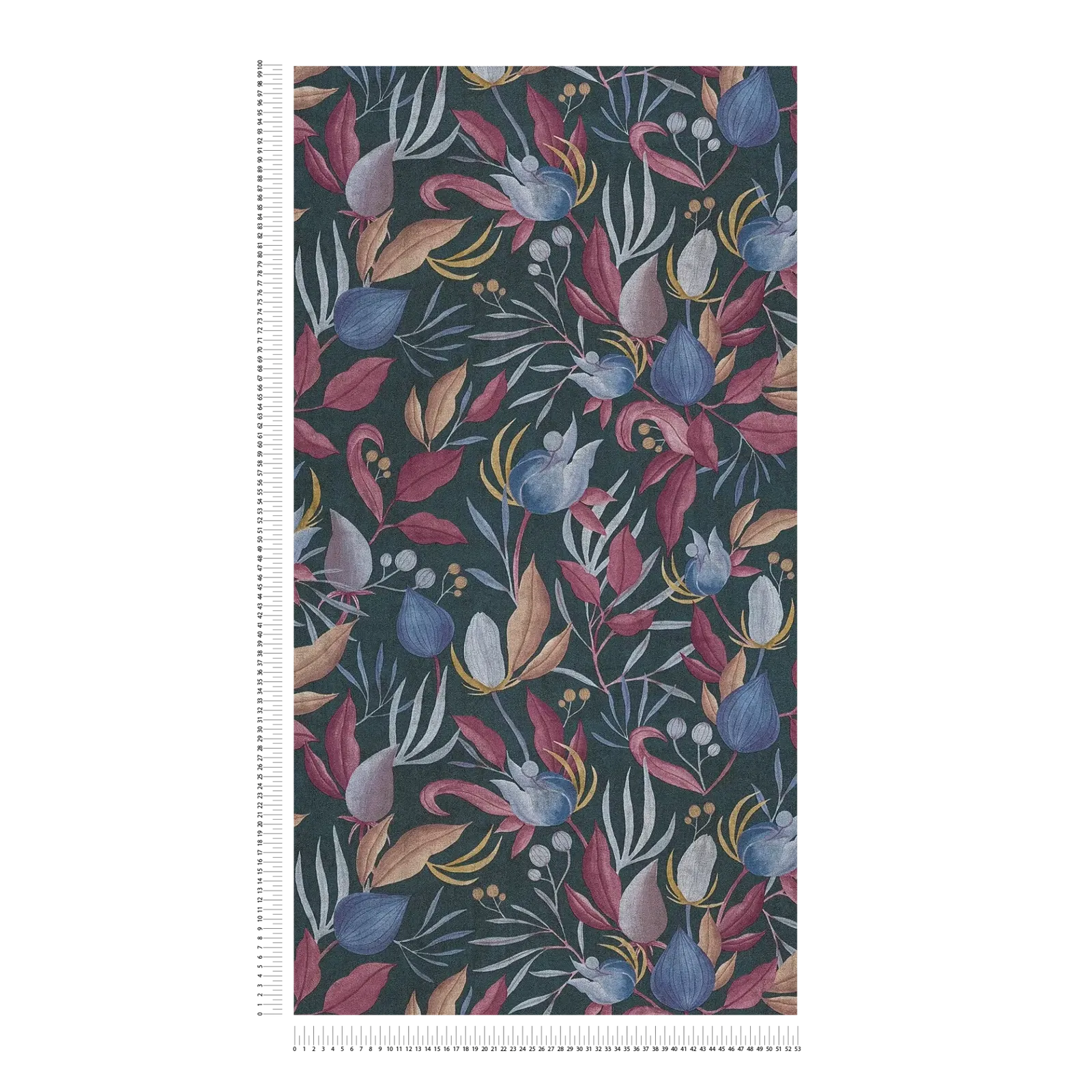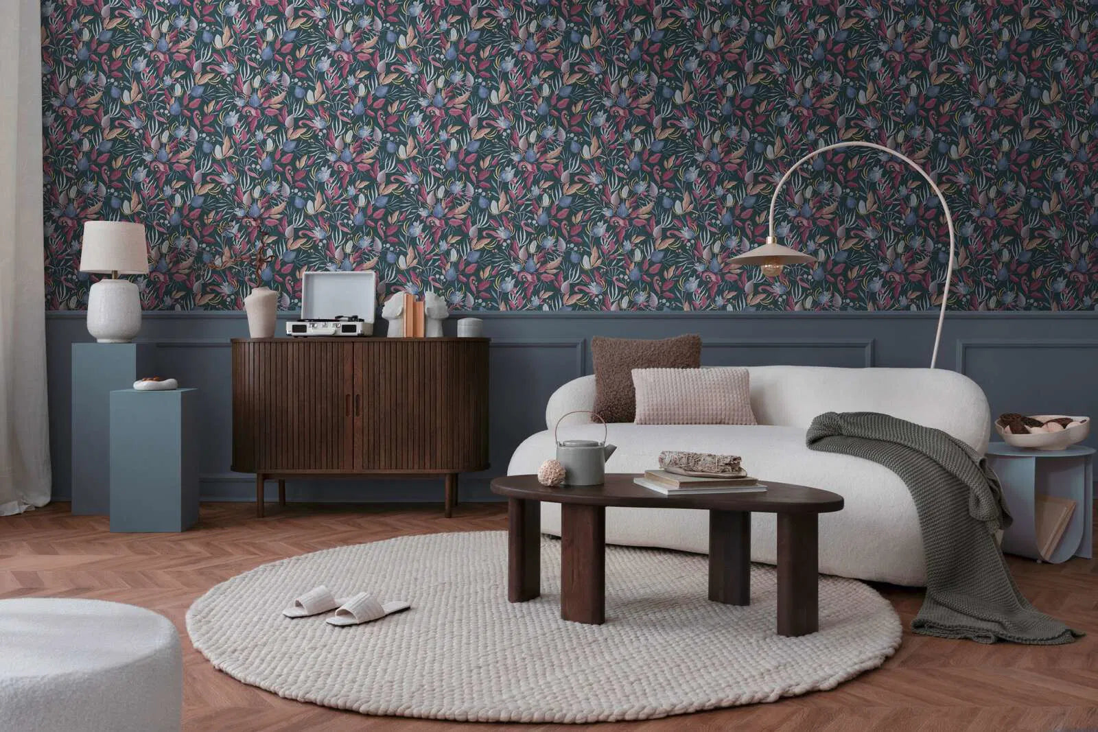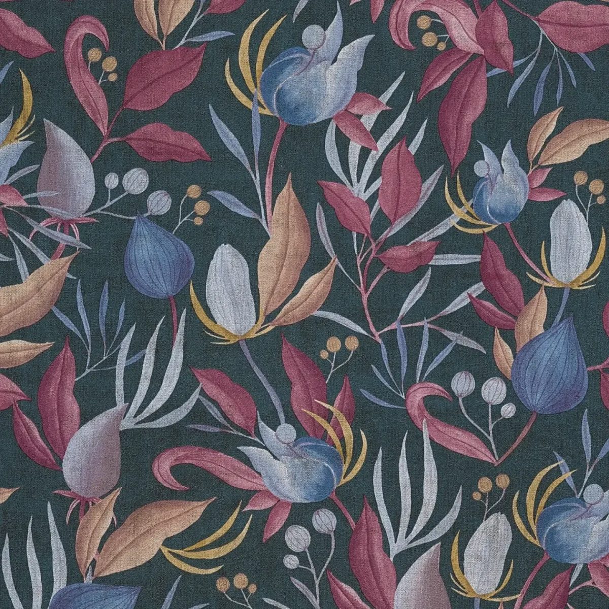 Tapetes motīvs attēlo blīvu, ziedu rakstu no fantāzijas pilniem abstraktiem ziediem un lapām. Krāsu paletei raksturīgi bagātīgi ogu toņi, īpaši violeti, bordo sarkani un violeti, ko papildina vēsi zili toņi un pasteļtoņi, gandrīz sudrabaini mirdzoši akcenti. Daži elementi izskatās kā zelta vai okera krāsas zari un rada siltus akcentus. Fons ir tumši zils līdz antracīta krāsā, kas izceļ spilgtos augu motīvus un piešķir dziļumu visam attēlam. Stils atgādina ar rokām gleznotas akvareļgleznojumus ar maigiem krāsu pārejiem un maigām kontūrām, piešķirot rakstam izsmalcinātu, nedaudz rotaļīgu, bet modernu pieskārienu. Kompozīcija ir dzīvīga un dinamiska, tomēr eleganta un atmosfēriska – ideāla, lai telpai piešķirtu ekstravagantu, bet harmonisku izskatu.