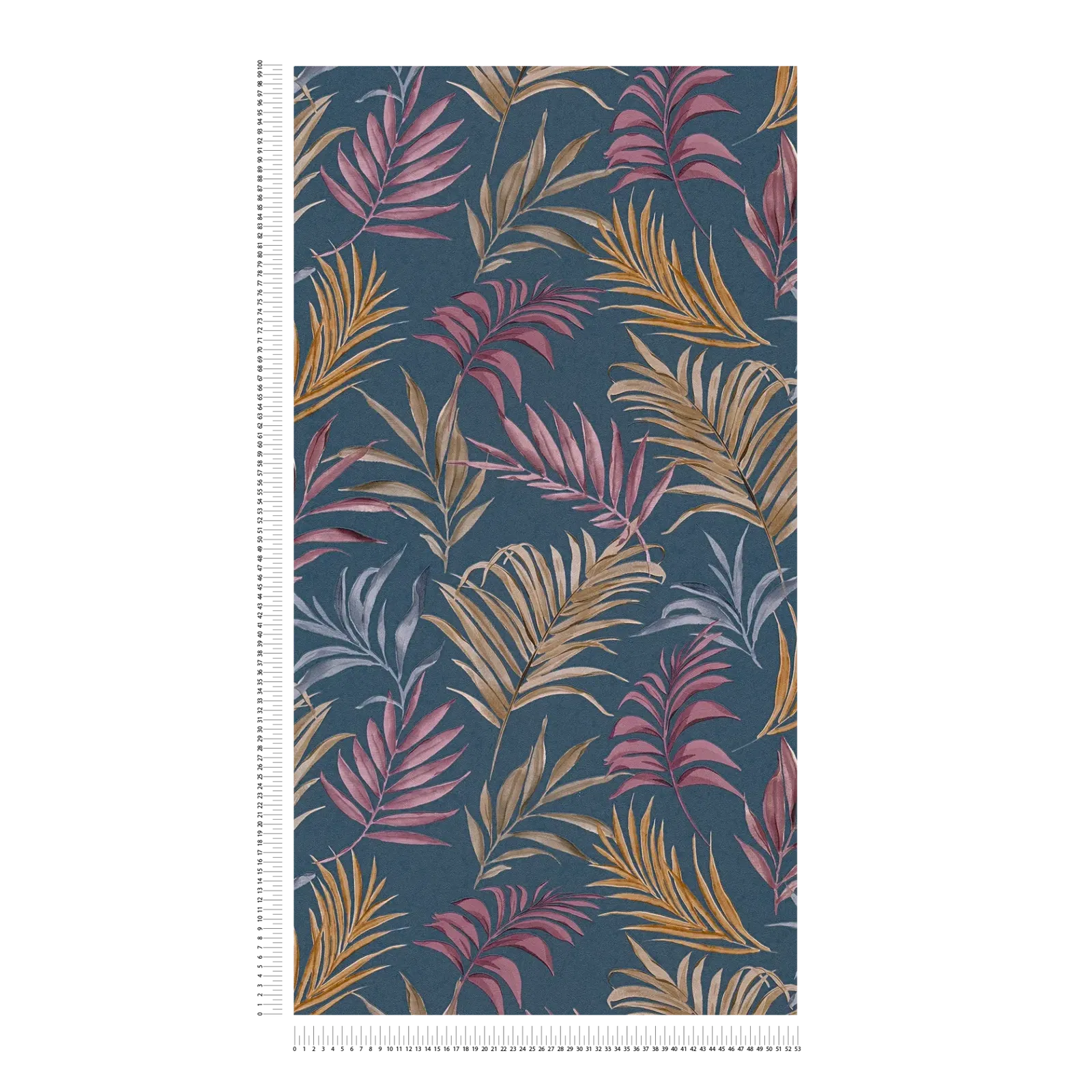 Šo tapetu raksts sastāv no brīvi izkārtotām, stilizētām palmu un papardes lapām, kas izkliedētas uz bagātīga, tumši zila fona. Lapas ir attēlotas harmoniskā krāsu paletē, kurā dominē silts sinepju dzeltens, kluss violets, zils violets un vēss pelēkzils. Kontūras un ēnojums rada gleznieciskas, akvareļveida efektu, kas motīviem piešķir vieglumu un gandrīz tekstilijas dziļumu. Krāsas ir elegantas un nomierinošas, bet ziedu dizains rada tropisku, eksotisku atmosfēru. Kopumā tapetes pauž līdzsvarotu modernitātes un dabas tuvuma sajūtu, kur vēsā fona un siltu, zemes toņu lapu krāsu kombinācija rada mājīgu, bet stilīgu telpas efektu.