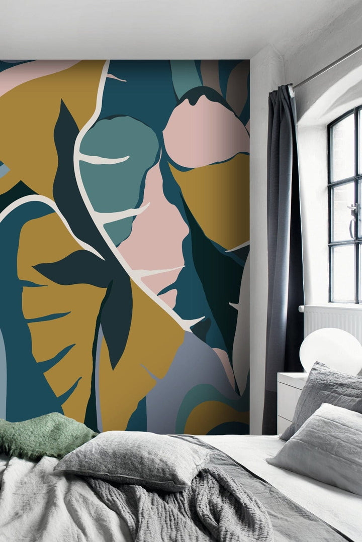 Sulīgas formas, drosmīgas krāsas - šeit vairāk ir vairāk. Nav brīnums, ka šis sienas attēls telpā rada bombastisku efektu. Lapas, ziedi un stublāji savijas un mirdz zilā, rozā, dzeltenā okera un baltā krāsā. Tas rada brīnišķīgi neparastu gleznu, kas izplešas pāri visai sienai.