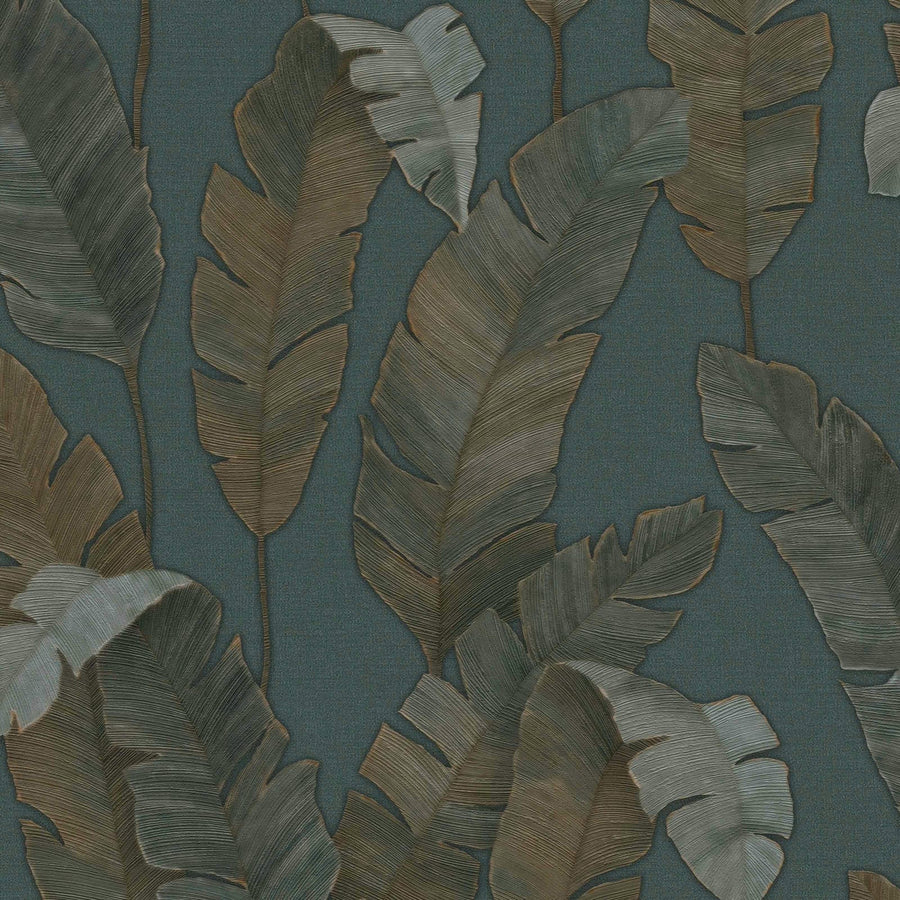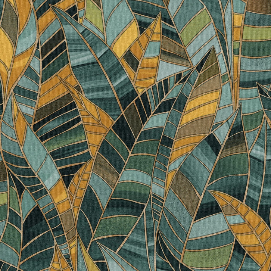 Wallpaper with stylised leaves green/turquoise/gold - 3770213
