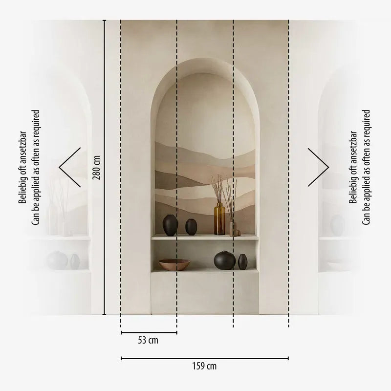 Soft, wavy lines in different shades of beige, sand and brown are arranged in layers throughout the wallpaper section. The motif is reminiscent of a tranquil dune landscape or flat hills, with fluid and gentle transitions between the different colour zones. The subtle colour tones create a warm, soothing atmosphere and overall look very harmonious and natural. The style is minimalist and modern, with a slight retro touch reminiscent of the aesthetics of the seventies. Organic lines and earthy tones create a timeless, elegant overall look that exudes both cosiness and stylish restraint.