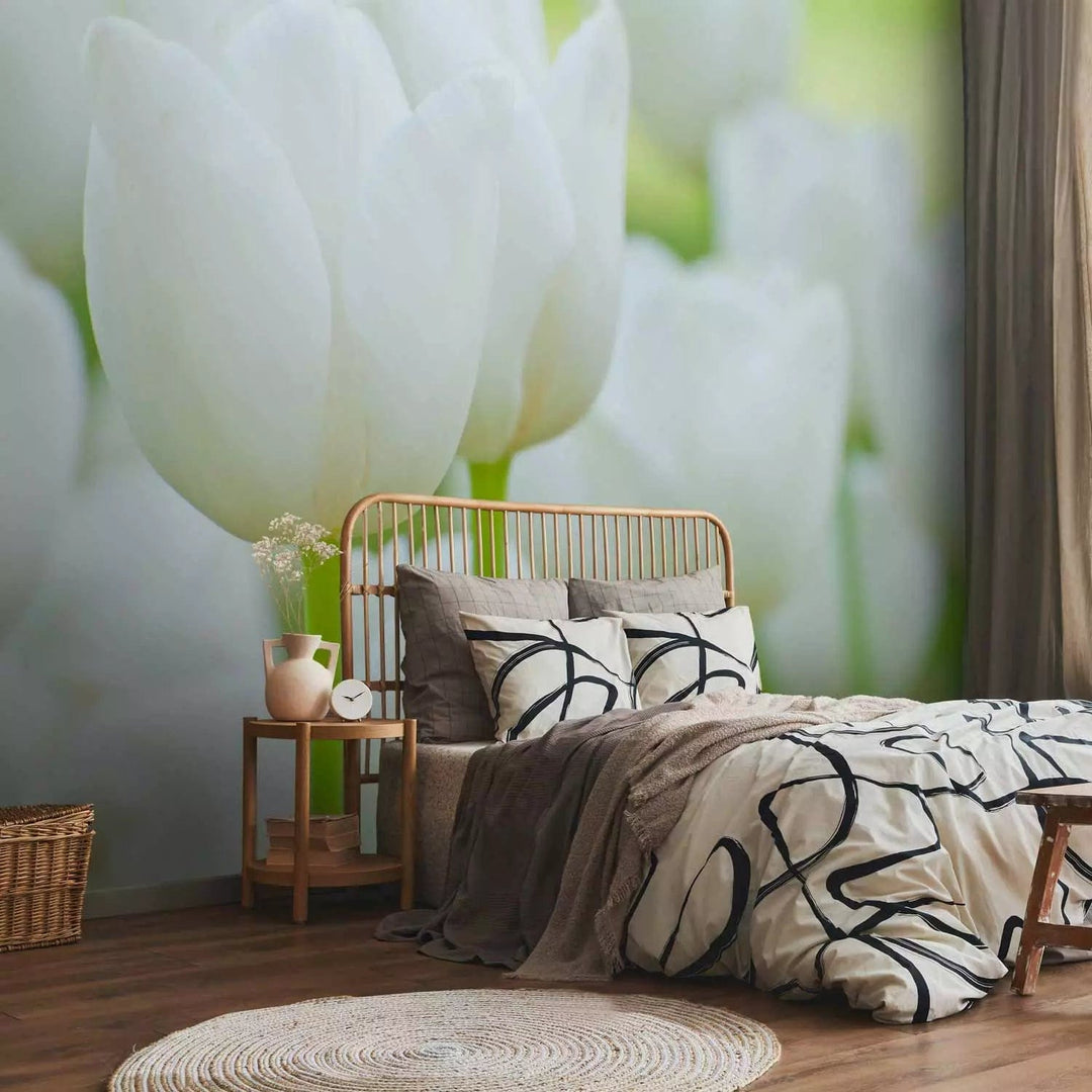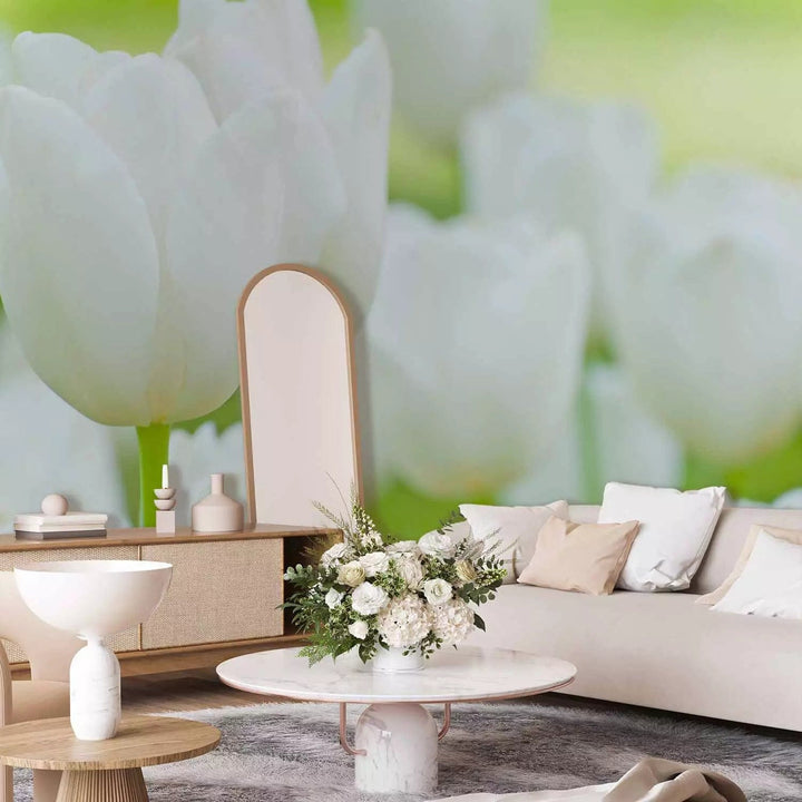 Wall Murals with white tulips on a green background - tulip fields, 60350
