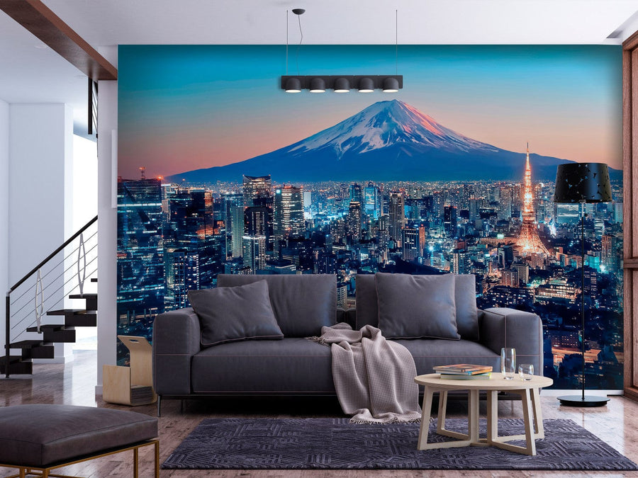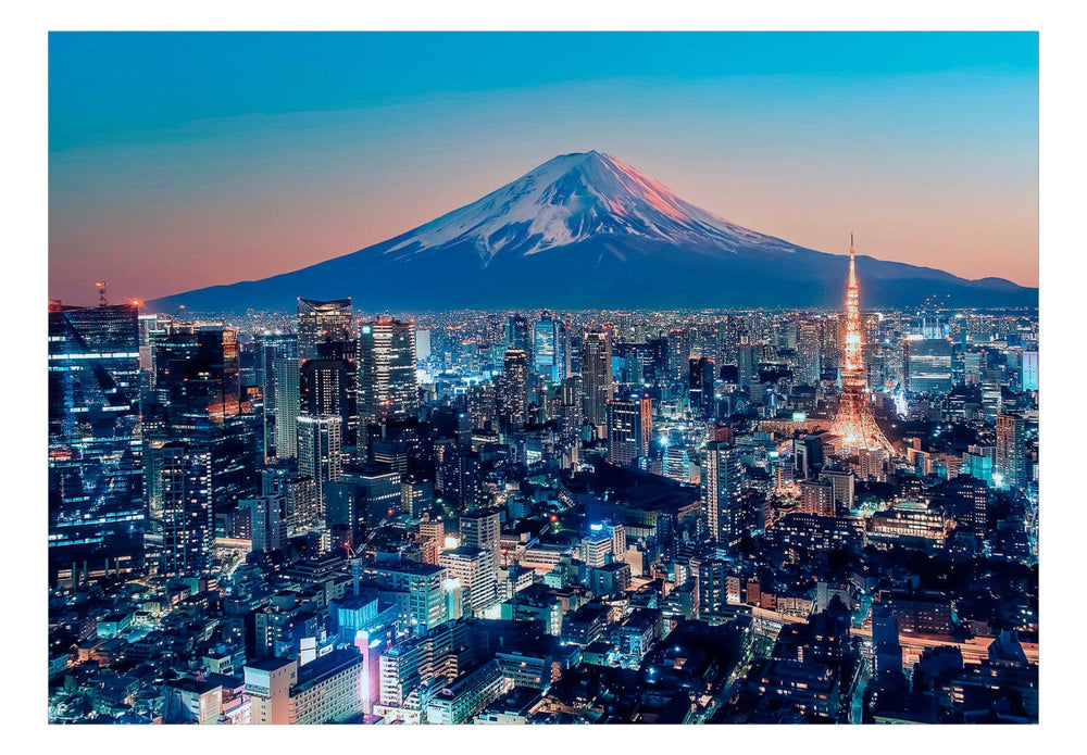 Fototapetes - Tokija saulrietā - debesskrāpji uz Fudzi kalna fona G-ART