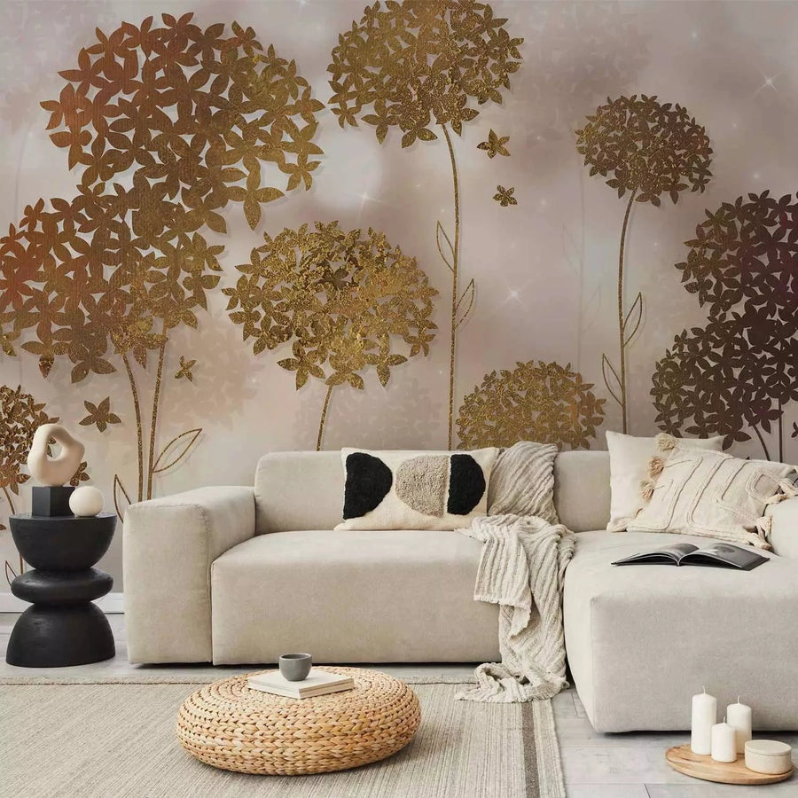 Fototapetes ar stilizētiem zeltā ziediem guļamistabas interjerā G-ART