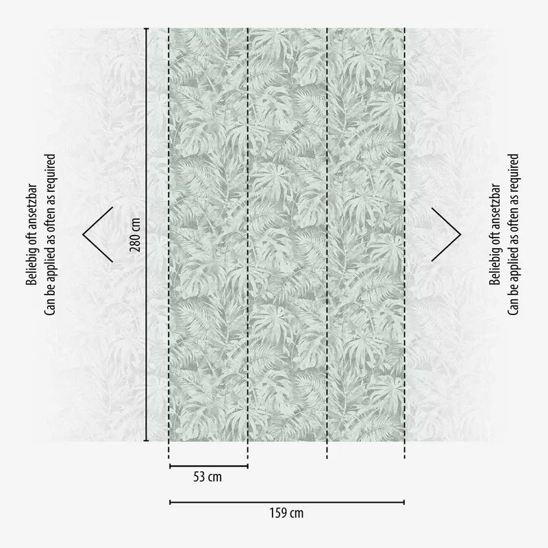 This wallpaper features dense foliage of various tropical plants, including monstera and palm leaves, which repeat harmoniously across the surface. The leaves are stylised and look almost as if they have been painted with a delicate brush, the outlines and fillings blending into one. The colour palette consists of various shades of cool, calm mint greens and greys, giving the overall image a very calm and relaxed atmosphere. The limited colour palette creates a soft, elegant look that combines exotic charm with modern restraint and thus fits harmoniously and unobtrusively into many room concepts. The slightly textured brushstroke effect gives the wallpaper a liveliness and depth.