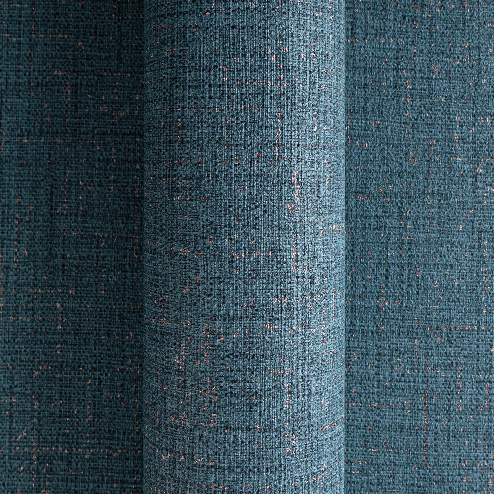 Tapetes raksts ir ar teksturētu virsmu, kas atgādina austos audumus, piemēram, linu vai rupju kanvasu. Smalkas, neregulāras līnijas un pavedieni vijās cauri visam dizainam, piešķirot tam smalku, dabisku tekstūru ar maigu vintage raksturu. Pamata krāsa ir bagātīga, klusa zila, kas nedaudz tendē uz benzīna krāsu un rada mierīgu, patīkamu telpisko efektu. Izkaisīti smalkie akcenti gaišākos un tumšākos zilo toņos, kā arī atsevišķas brūnganas un pelēkas nianses pastiprina materiāla izskatu un rada dziļumu. Stils ir skaidrs, laikmetīgs un neuzbāzīgs, padarot šīs tapetes universālas, piemēram, modernos, skandināvu vai urbānos interjeros. Krāsu gamma rada nomierinošu, mājīgu efektu un izstaro atturīgu eleganci.