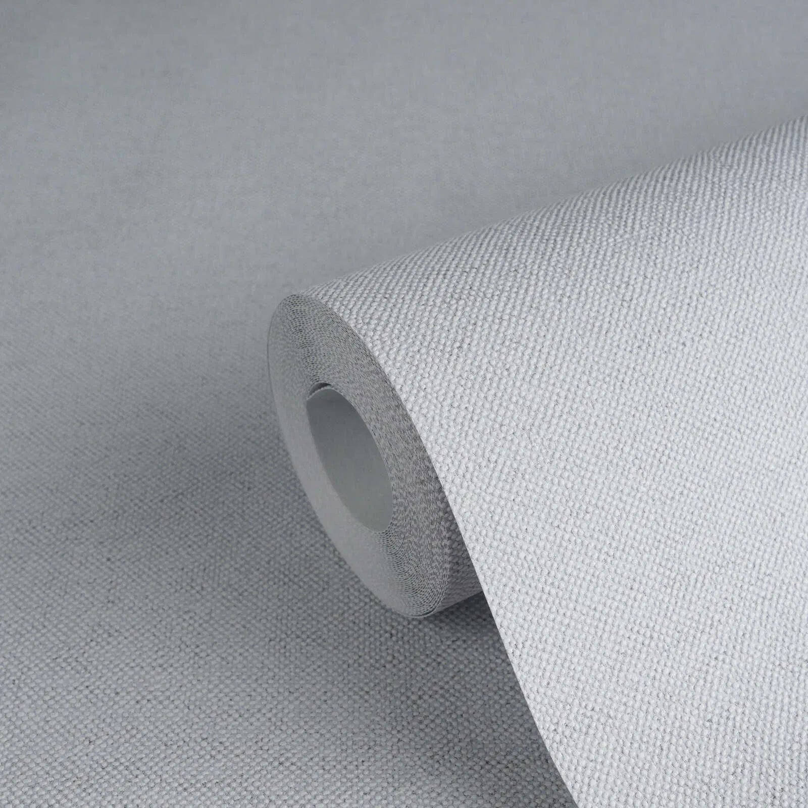 The wallpaper has a subtle, textured textile pattern in a soft, light gray tone. The surface looks almost like woven fabric, with delicate, slightly diagonal lines reminiscent of linen or cotton. The pattern is discreet and unobtrusive, allowing the wallpaper to create a calm, restrained atmosphere. The color palette is a cool silvery gray that reflects a lot of light and thus brightens up the room without looking cold or sterile. Overall, this wallpaper gives the room an elegant, modern look with a cozy warmth that is ideal as a subtle backdrop for a variety of interior design styles.