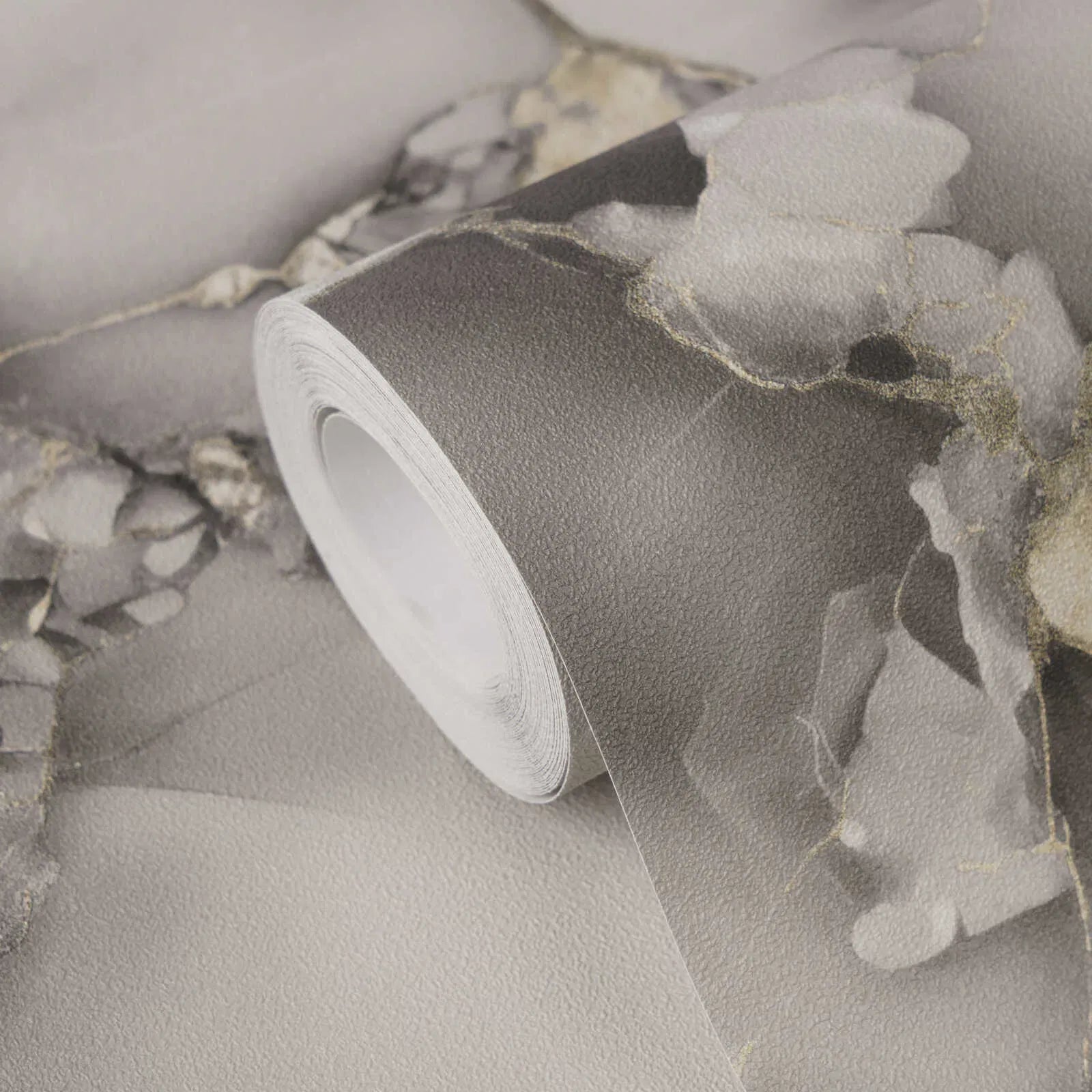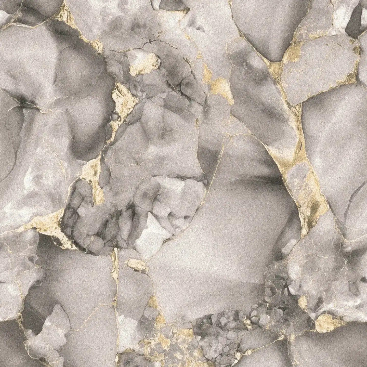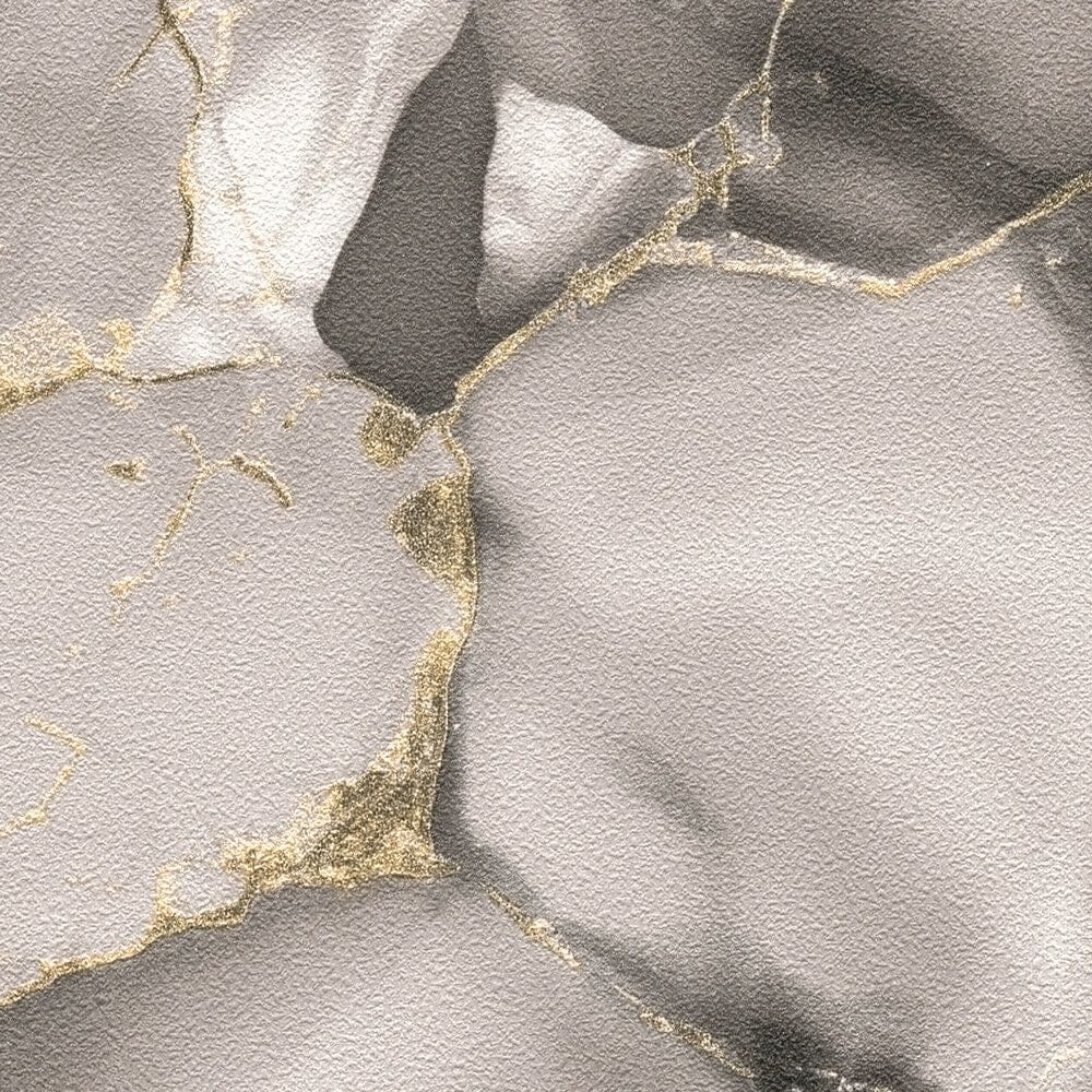 The wallpaper has an abstract marble pattern characterized by flowing gray tones and fine gold lines. The motif is reminiscent of natural rock formations or a watercolor painting, where gold, like a fine gold leaf, is applied to light and dark marble patterns, creating elegant highlights. The color palette ranges from soft light gray to deep anthracite and expressive gold accents, creating a luxurious yet modern and timeless atmosphere. The style is sophisticated and artistic, almost like a refined interpretation of kintsugi – the Japanese art of repairing broken objects with gold. The wallpaper has a calming yet lively effect, adding glamour and exclusivity to any room.