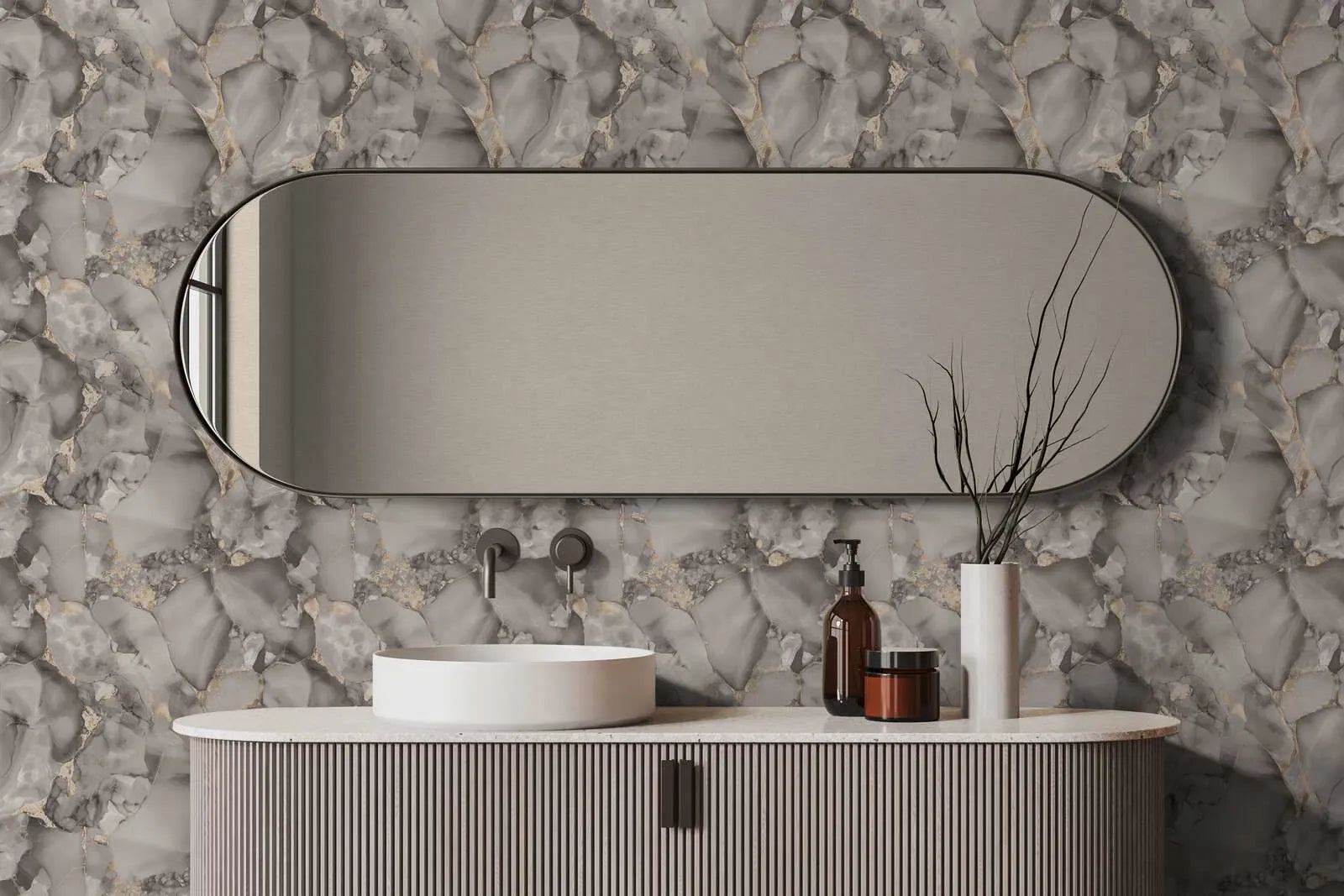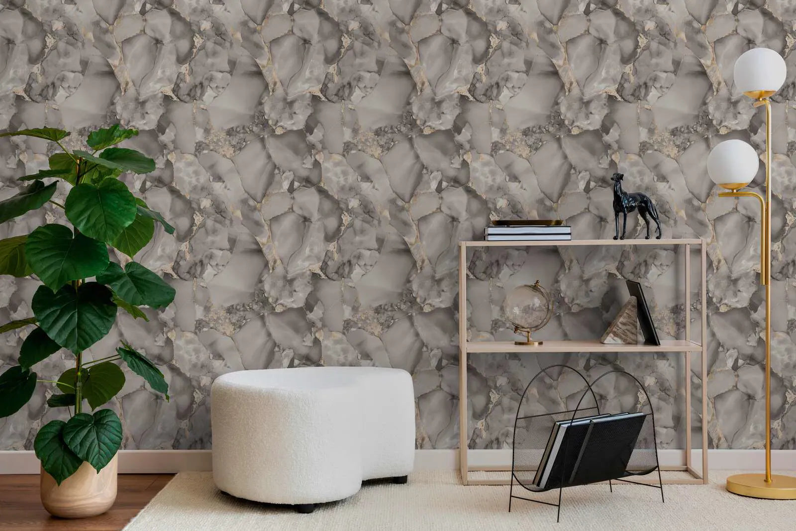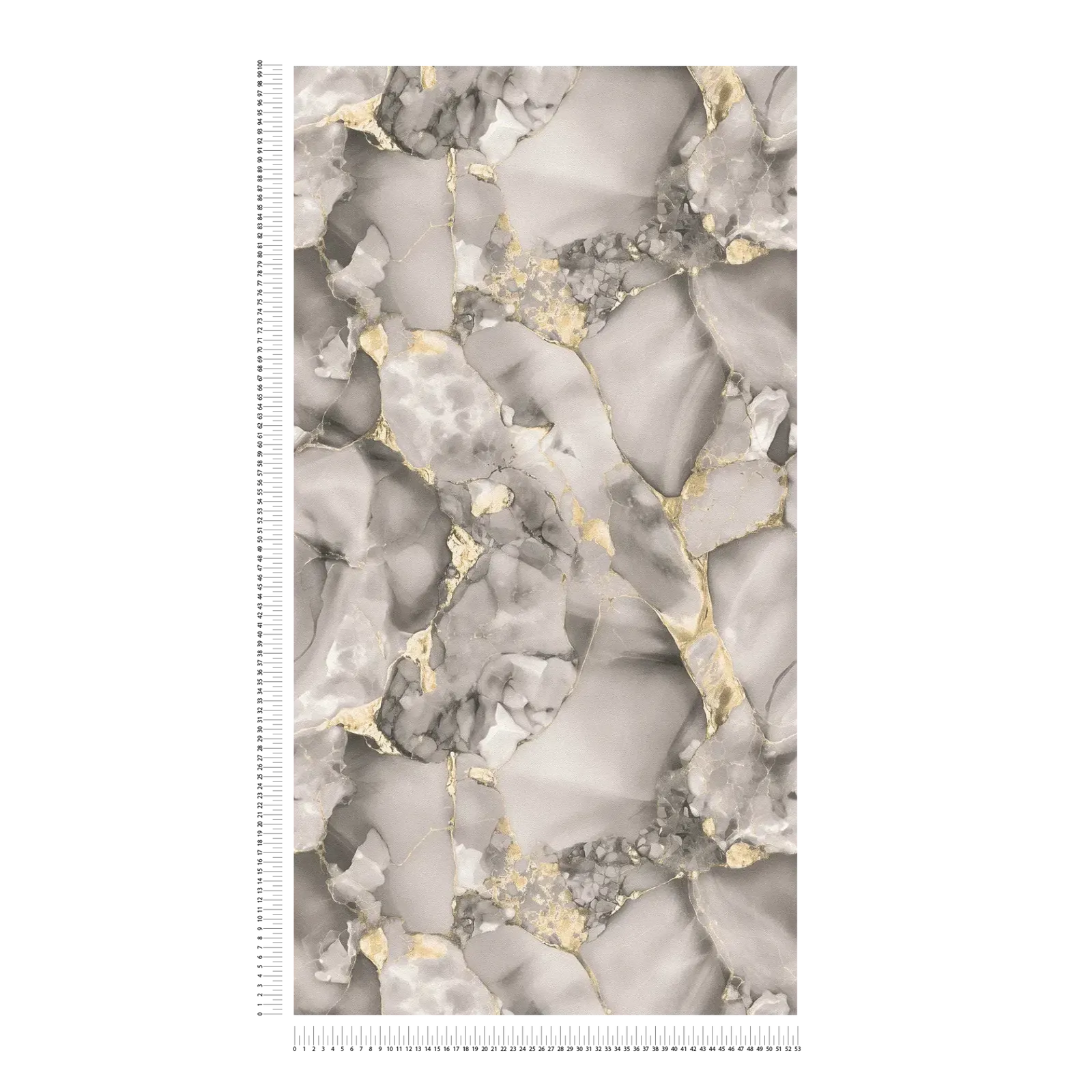The wallpaper has an abstract marble pattern characterized by flowing gray tones and fine gold lines. The motif is reminiscent of natural rock formations or a watercolor painting, where gold, like a fine gold leaf, is applied to light and dark marble patterns, creating elegant highlights. The color palette ranges from soft light gray to deep anthracite and expressive gold accents, creating a luxurious yet modern and timeless atmosphere. The style is sophisticated and artistic, almost like a refined interpretation of kintsugi – the Japanese art of repairing broken objects with gold. The wallpaper has a calming yet lively effect, adding glamour and exclusivity to any room.