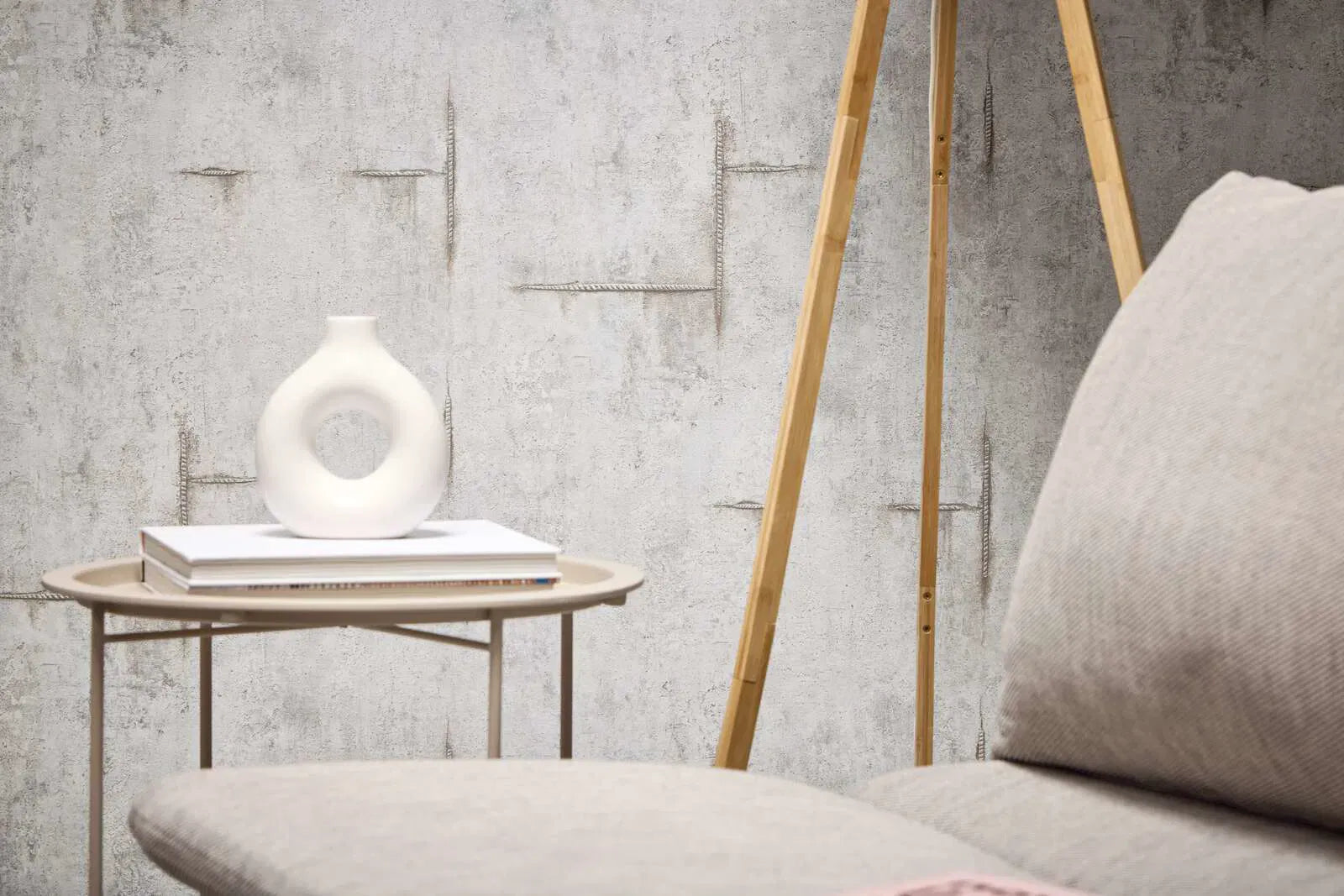 Tapetes raksts ir ar smalku, raupju virsmu, galvenokārt gaišos, klusos pelēkos un smilškrāsas toņos, kas atgādina nokaltušu betonu vai apmetumu. Krāsu gamma ir atturīga un neitrāla, bet tekstūra atgādina matētu un nedaudz spīdīgu virsmu maisījumu. Virsmu atkārtoti pārtrauc smalkas, lineāras reljefas: horizontālas un vertikālas līnijas, kas izskatās kā reljefas zīmes un atgādina metāla bruņas, piešķir tapetēm industriālu raksturu. Līnijas ir nedaudz rūsainas, brūngani pelēkas, izskatās kā roku darbs un uzsver lietoto izskatu. Kopumā rezultāts ir moderns, urbāns stils ar smalku vintage pieskaņu, kas telpai piešķir mierīgu, bet dzīvīgu atmosfēru.