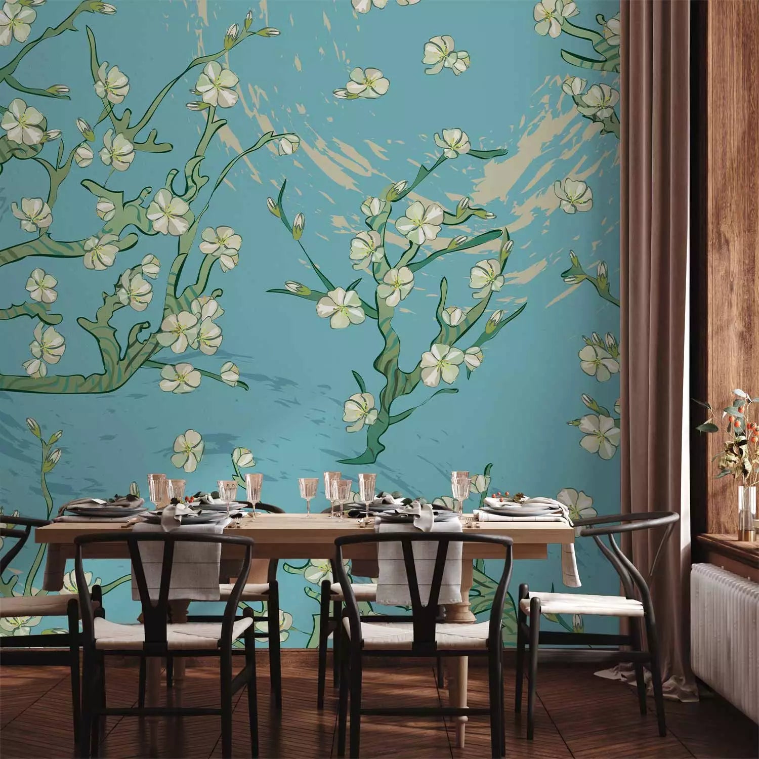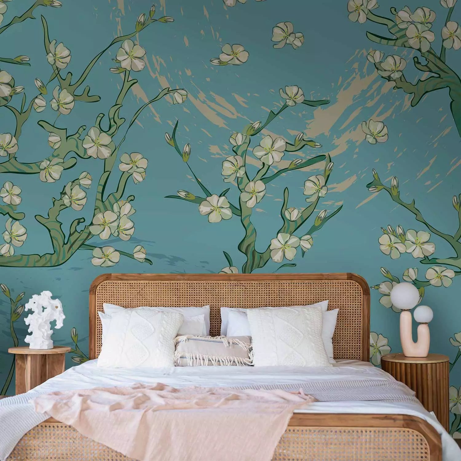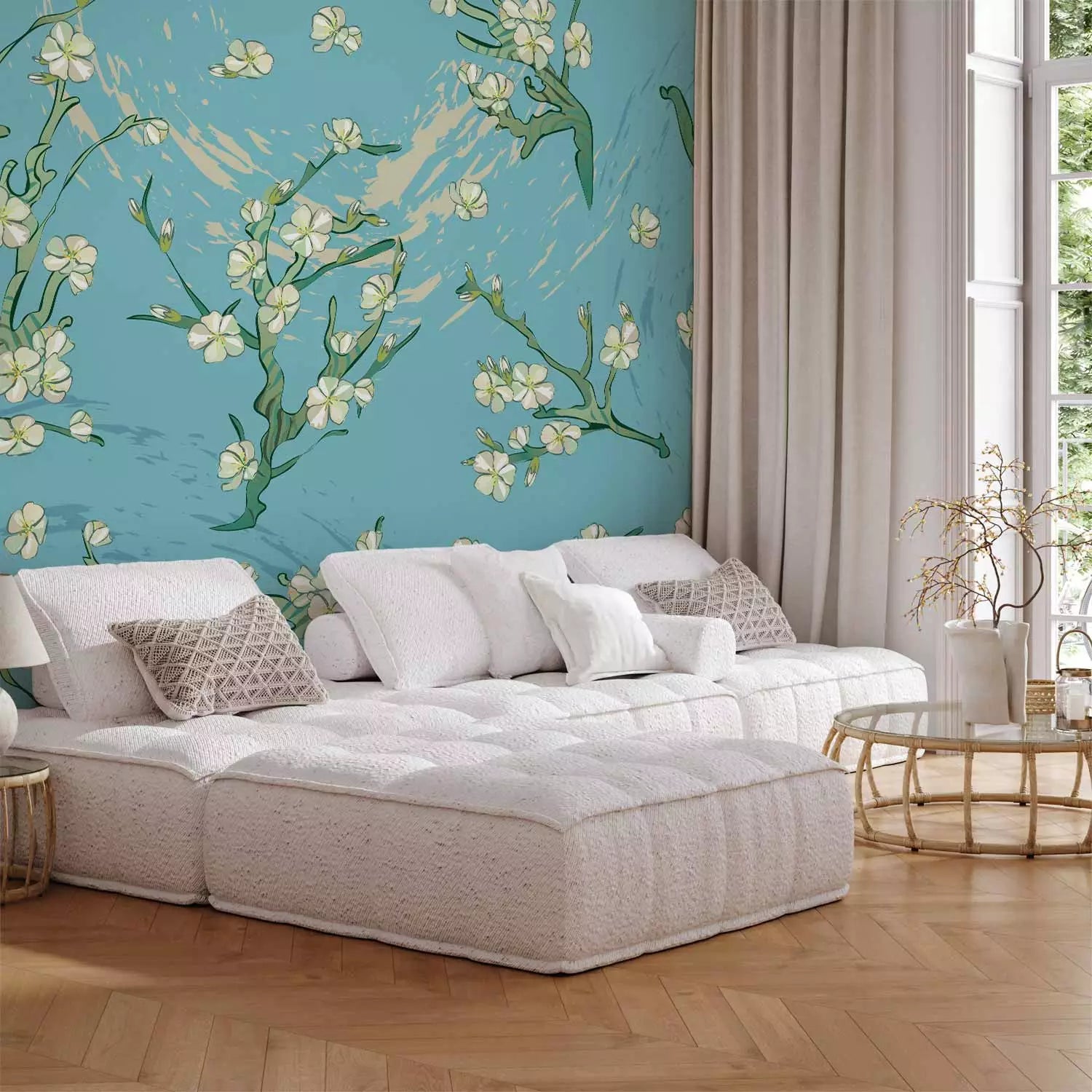 Oriental-style photo wallpaper in blue tones - Asian flowers, 142435