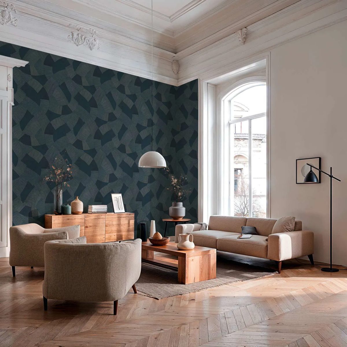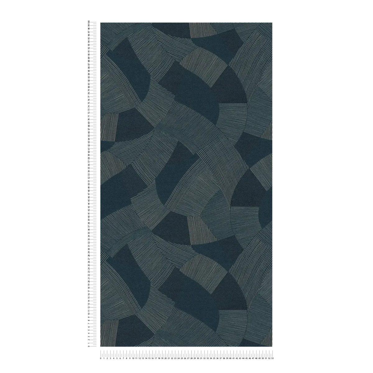 Luxurious wallpaper with a deep tone and a slight sheen. High wear resistance allows it to be cleaned with a brush and soapy water, preserving the freshness of the color. Pattern matching (64 cm) is simple and ensures a flowing design. The dark blue color combined with the geometric line pattern creates an exclusive and calming atmosphere. The circular segments and line graphics on a dark background stand out with a subtle sheen, reminiscent of Art Deco elegance. The ideal choice for a bedroom or living room to create an intimate and stylish environment.