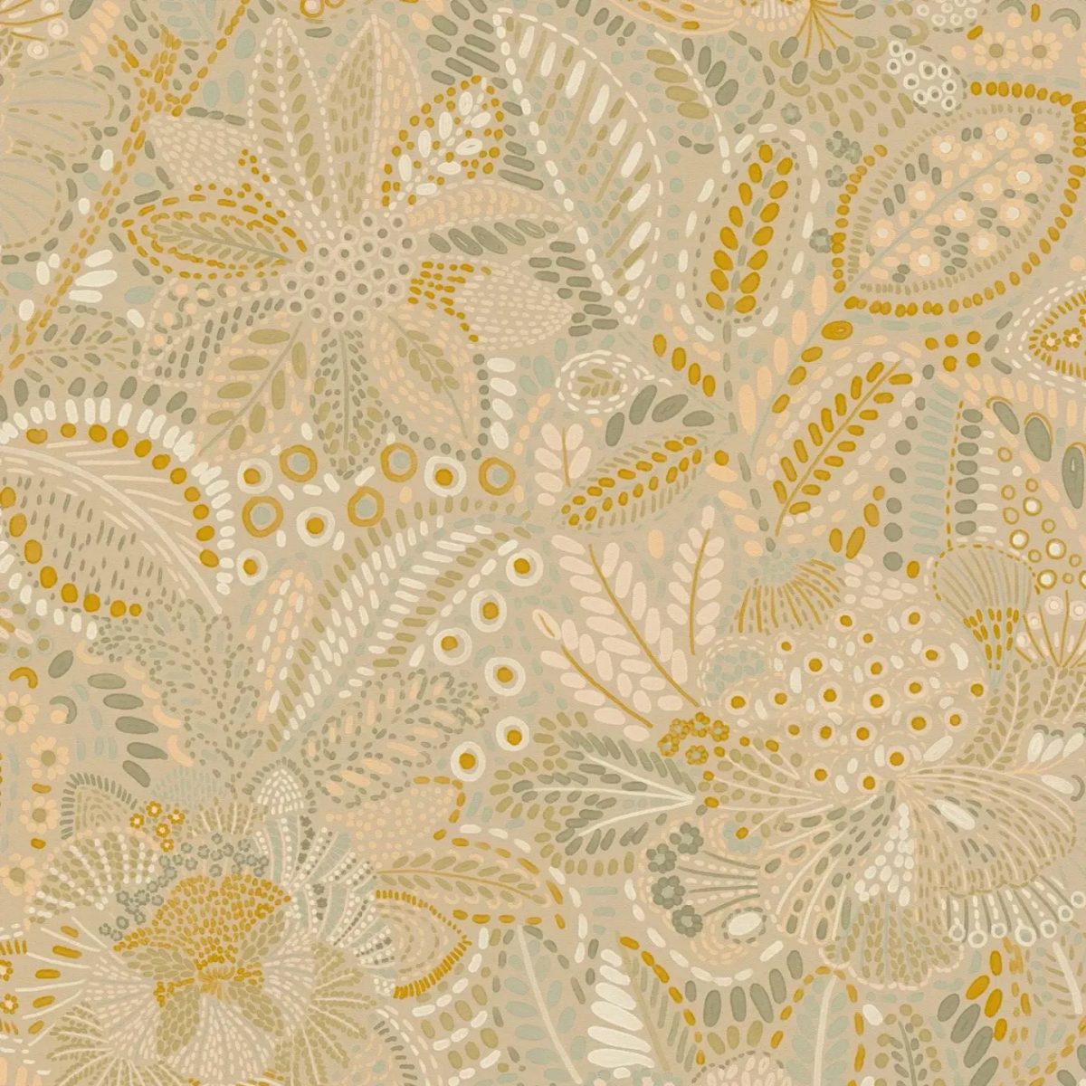 Romantic and natural wallpaper with a matte, textured surface. They are easy to keep clean thanks to the high-quality surface treatment. When gluing, observe a 64 cm pattern repeat for a precise flower connection. Green plant and leaf ornaments create a harmonious and relaxing environment. Unlike large palm trees, this pattern is more delicate and detailed, reminiscent of botanical illustrations. A great choice for bringing nature into your urban home.