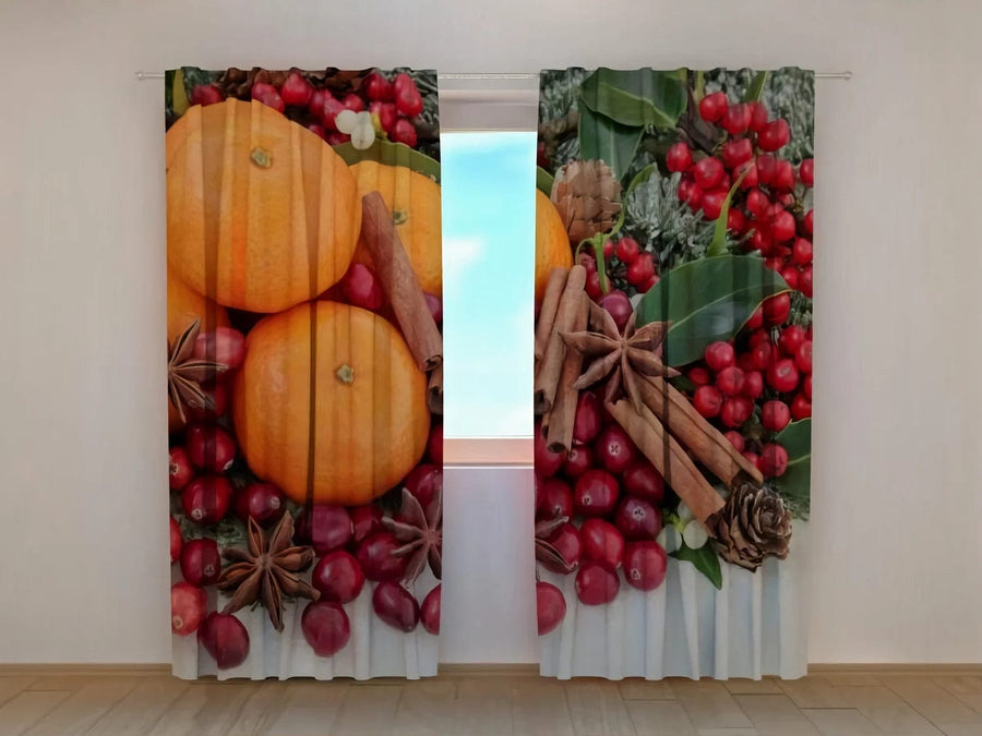 Christmas curtains - decorative composition: Oranges and cinnamon