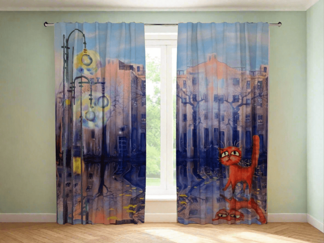 Curtains for children's room with a cat drawn on the street
