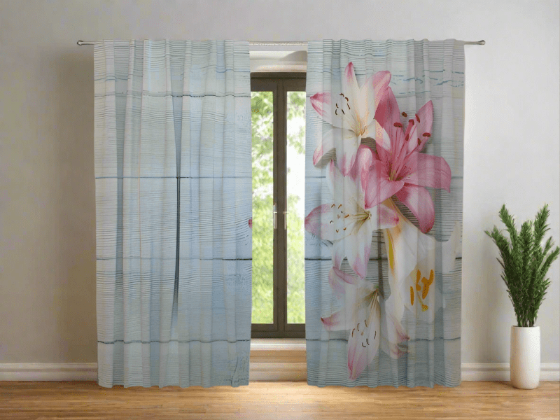 Dienas un nakts aizkari istabai ar ziediem - Krāsainas lilijas uz koka Tapetenshop.lv