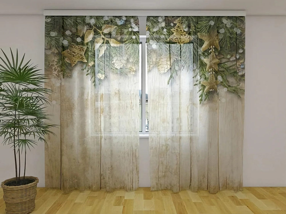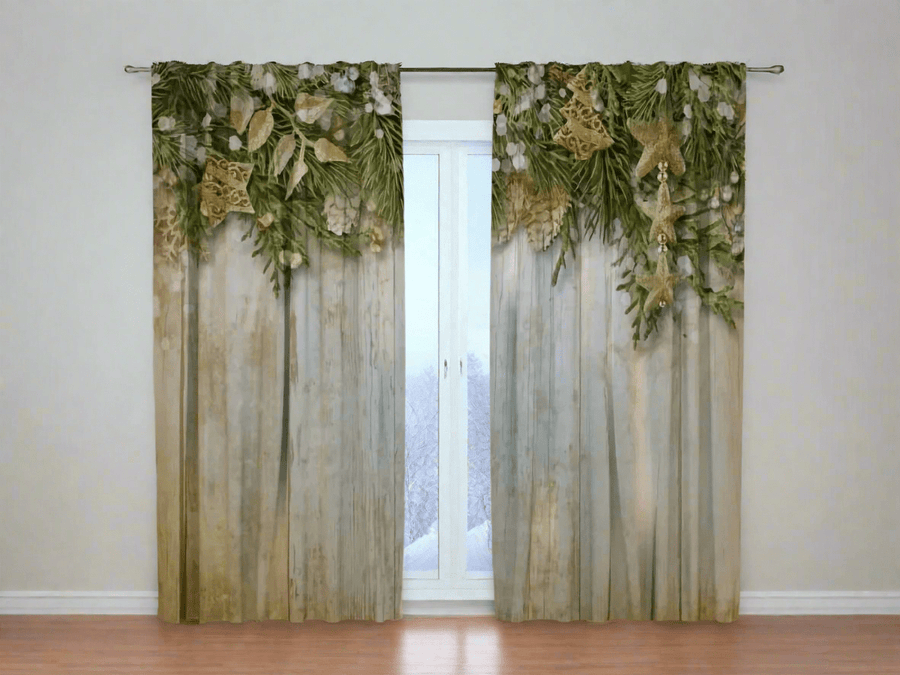 Ziemassvētku aizkari ar zeltainu rotājumu un egles zaru - pirkt Tapetenshop.lv