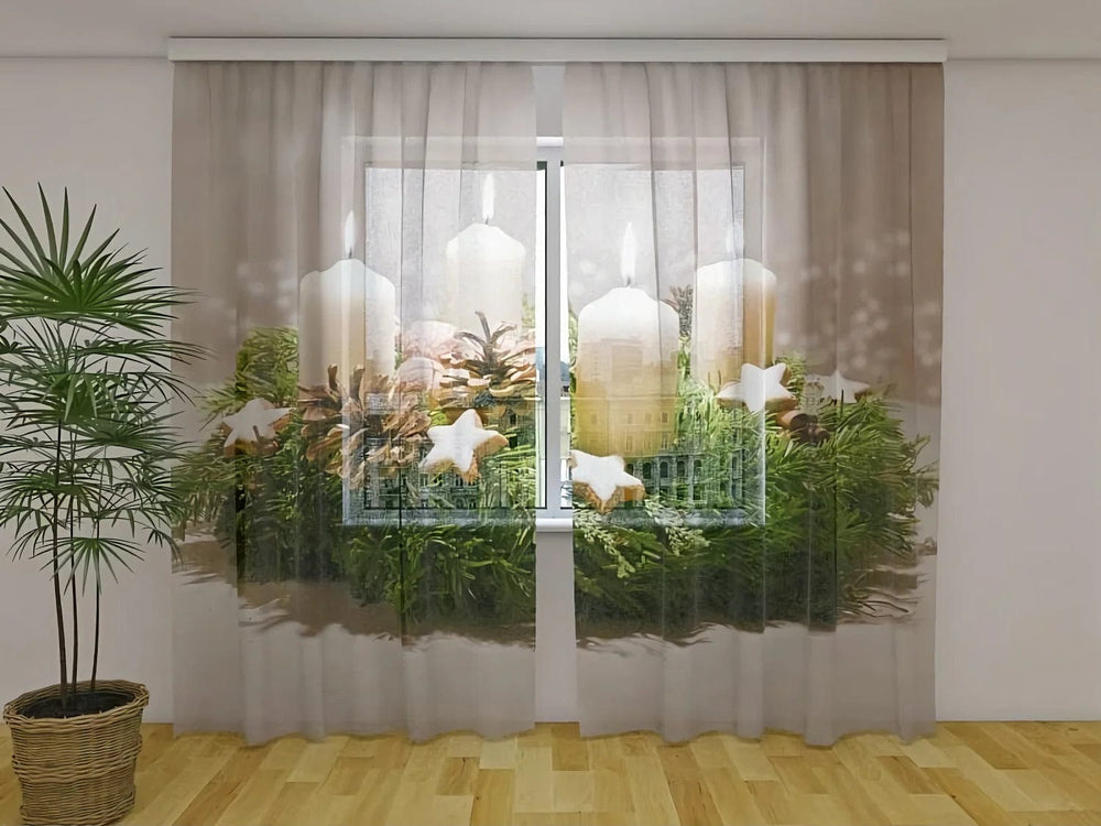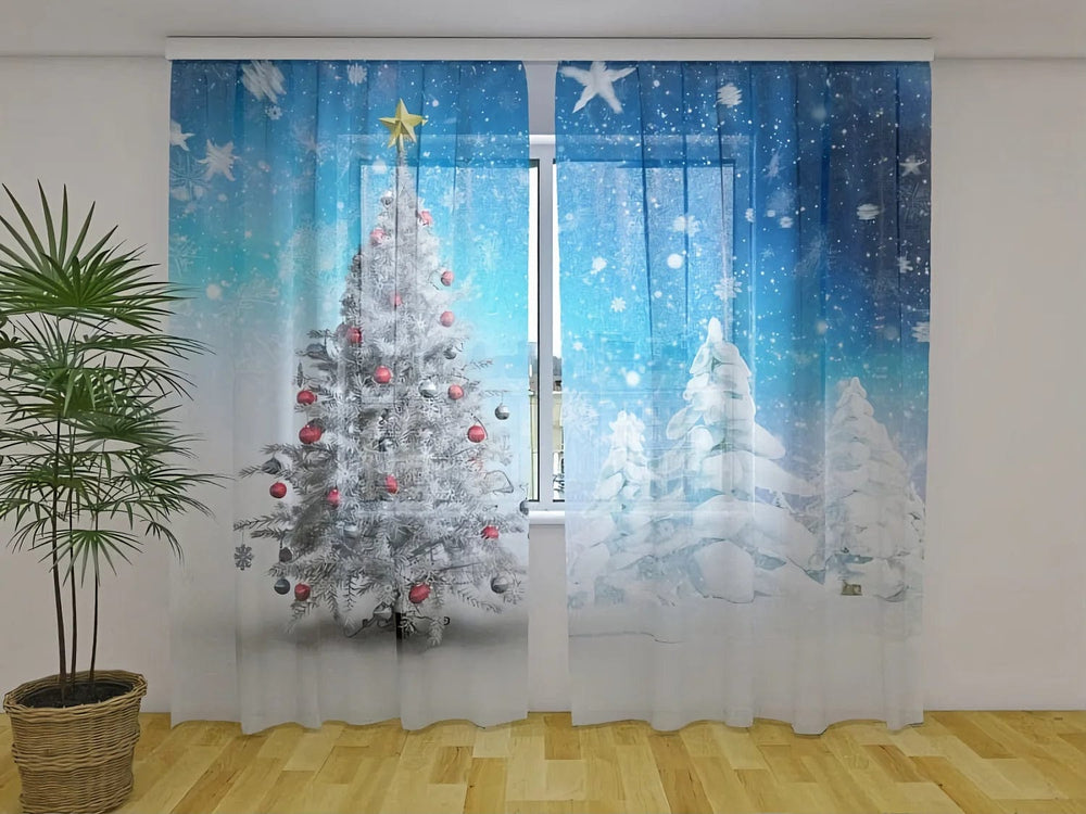 Ziemassvētku aizkari viesistabai - Baltās Ziemassvētku eglītes Tapetenshop.lv