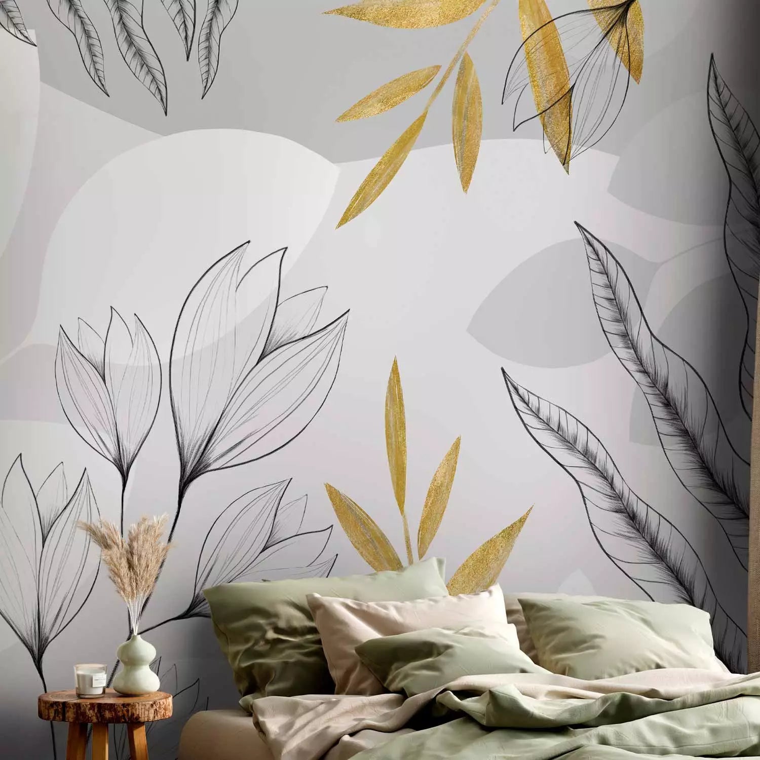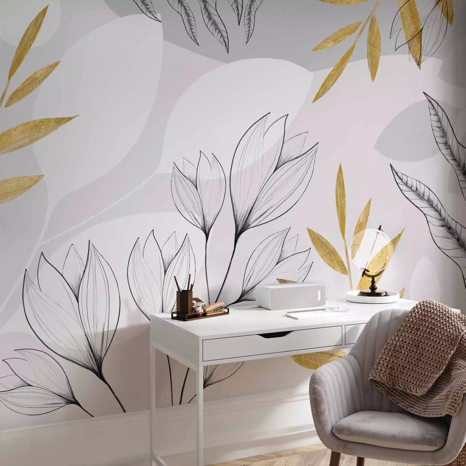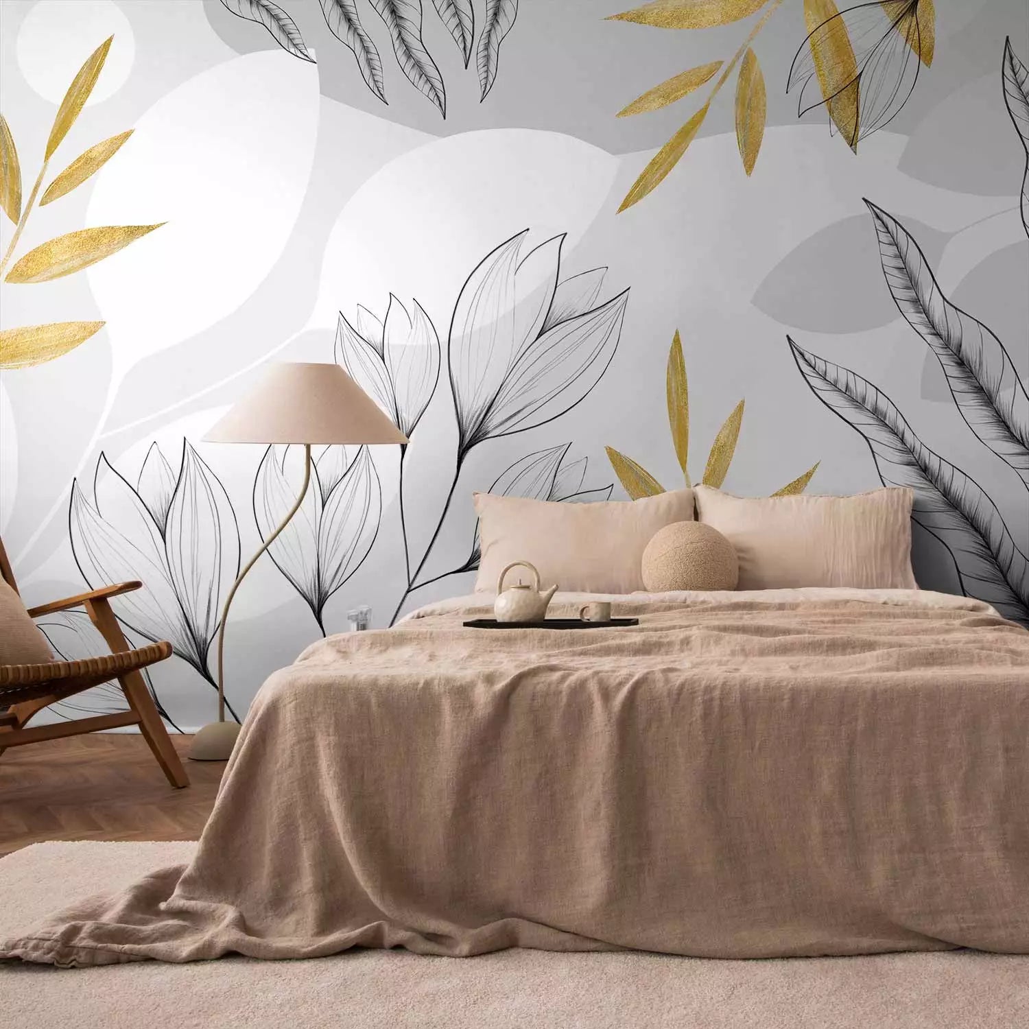 Wall murals - Leaves and flowers with gold elements, 138803