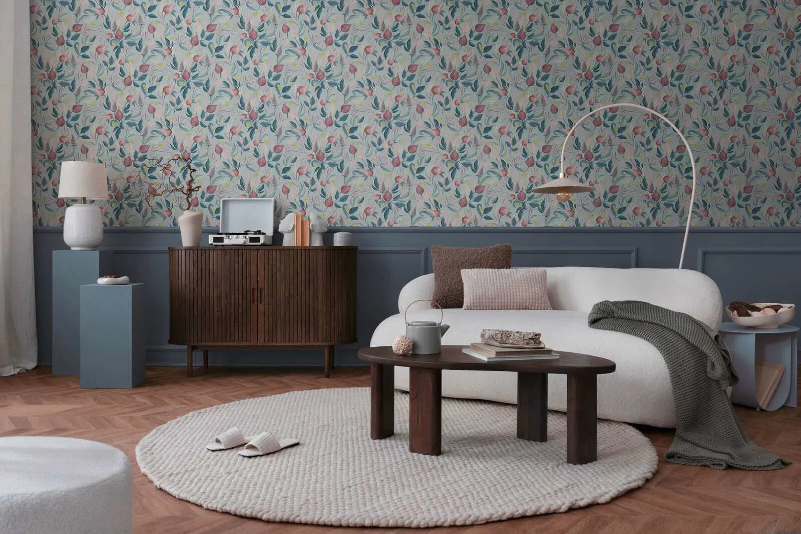 Delikāti ziedu raksti vienmērīgi izvietoti uz pasteļzila fona. Liela izmēra ziedu pumpuri maigās rozā, tumši rozā un bordo toņos ierāmēti ar ziliem un pasteļzaļiem lapām. Starp ziediem izkaisīti smalki, delikāti zariņi pūderrozā krāsā, starp kuriem izvietoti mazi, spilgti dzelteni punktiņi, radot svaigu akcentu. Kopējais efekts ir maigs un harmonisks, stils atgādina delikātu akvareļu gleznu ar vintage pieskaņu. Motīvs izstaro mieru, vieglumu un romantiku, bet vienlaikus izskatās moderns un stilīgs. Maigā, klusā krāsu gamma rada mājīgu, līdzsvarotu atmosfēru un padara tapetes par acu piesaisti ar smalku elegances pieskārienu.