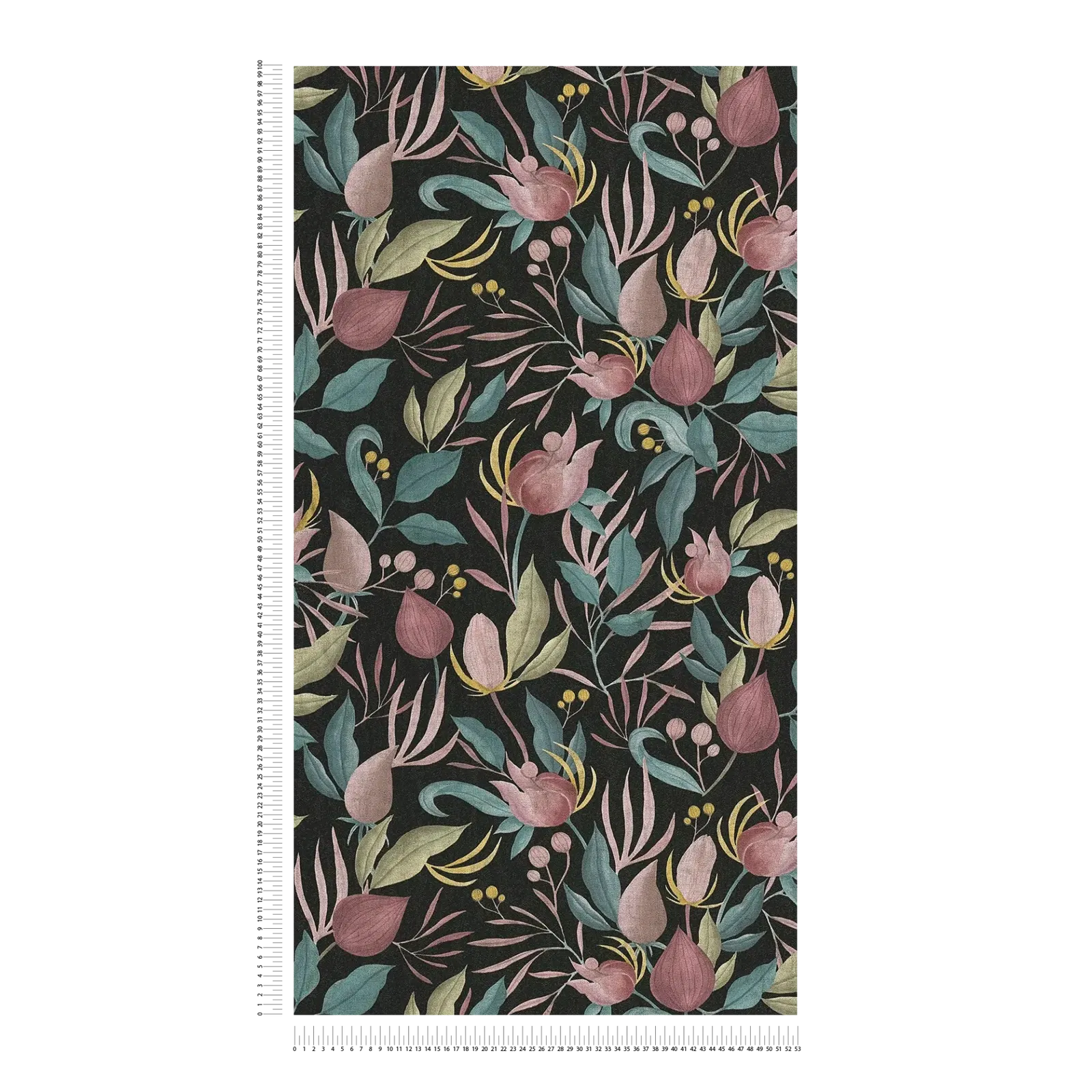 Iztēles bagāts ziedu raksts ar daudzveidīgiem stilizētiem ziediem, lapām un pumpuriem izceļas uz tumši melna fona. Ziedu elementi ir maigās, pūderveida krāsās: ziedos dominē tumši rozā, violeti un bordo sarkani toņi, bet lapas ir dažādos mīkstā zaļā, benzīna un zils pelēkā toņos. Delikāti dzeltenie toņi izceļ kompozīciju un piešķir tai dzīvīgumu. Formas ir maigas, nedaudz abstraktas un izskatās kā ar rokām gleznotas, piešķirot motīvam māksliniecisku, gandrīz tekstilijas izjūtu. Tumšā fona un pasteļtoņu mijiedarbība rada elegantu, nedaudz noslēpumainu atmosfēru ar retro šarmu un modernu svaigumu.
