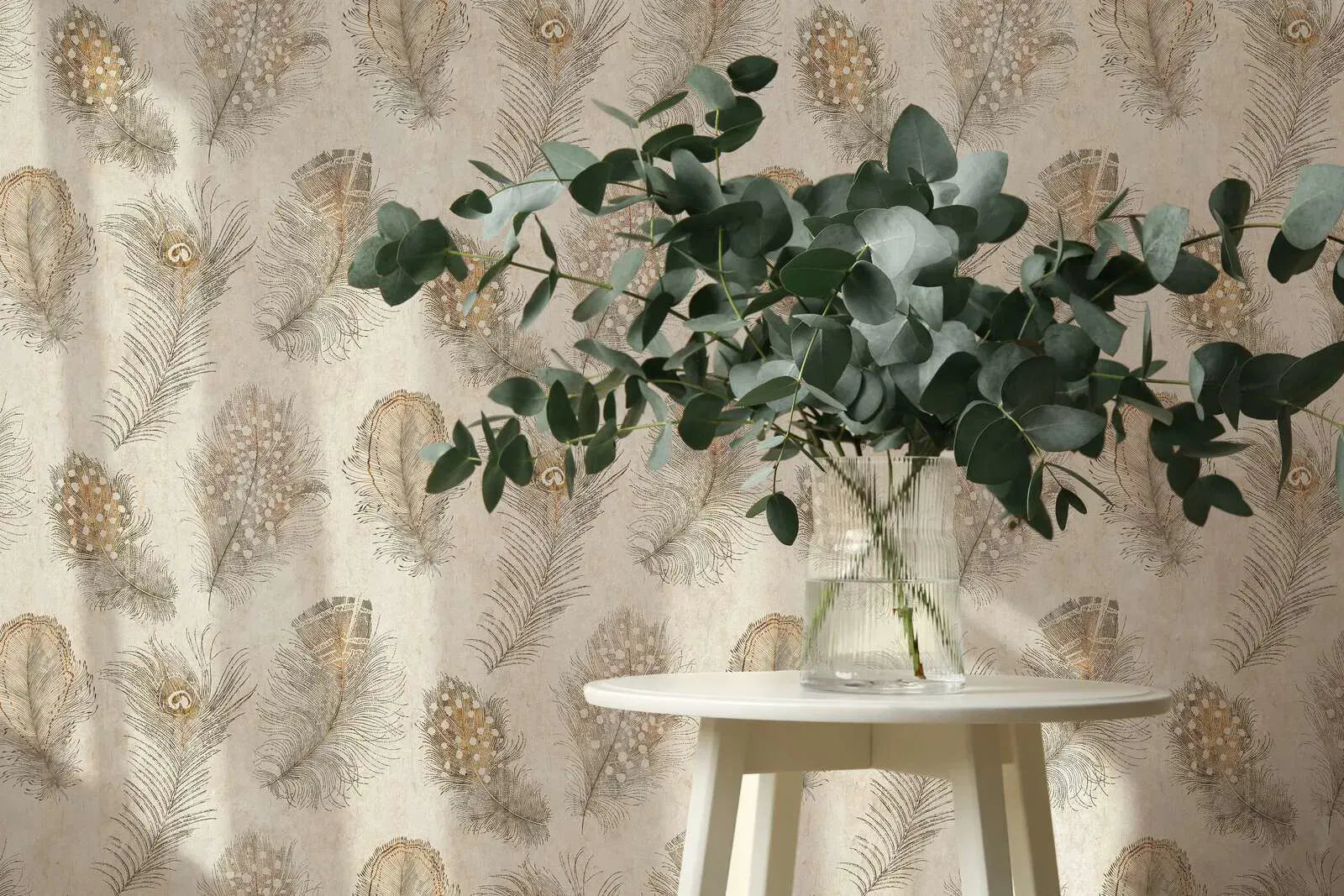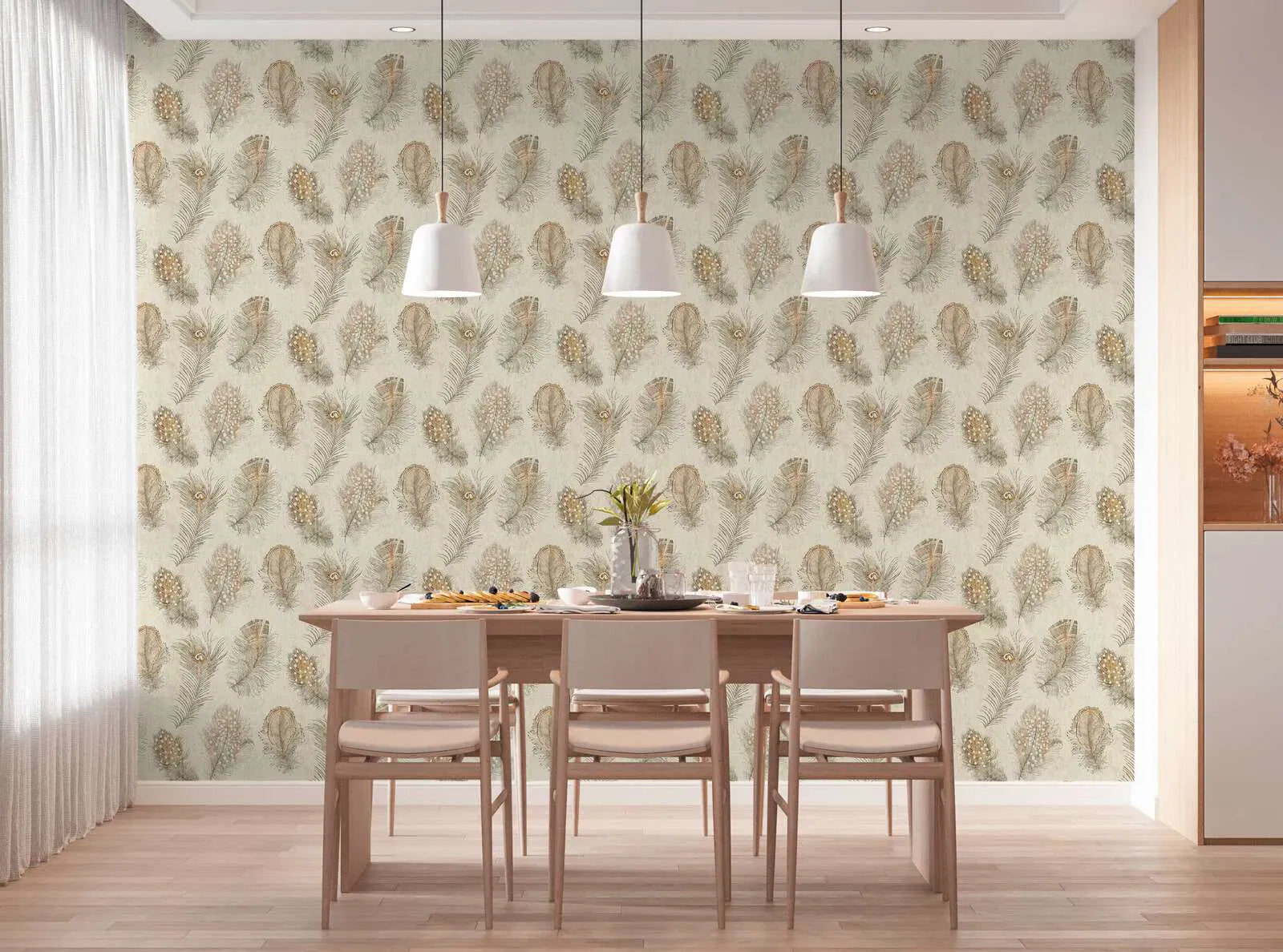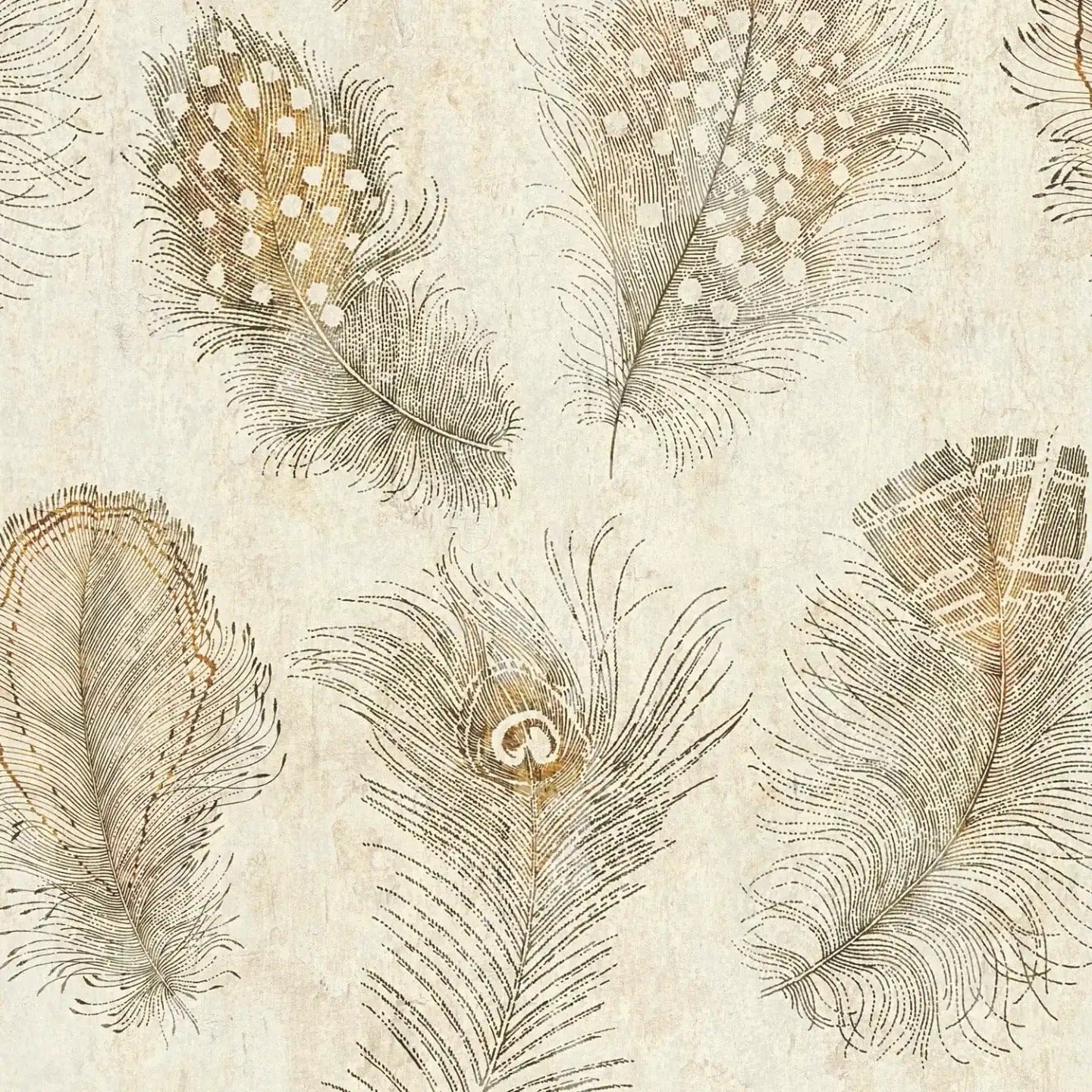 Õrn, suuremahuline sulgemotiiv pehme kreemika taustal, mida rõhutavad õrnad kuldpruunid jooned, mis peegeldavad sulgede õrna tekstuuri ja dünaamilist liikumist. Disain meenutab stiliseeritud paabulinnu või jaanalinnu sulgi, mille kõverad jooned ja punktidega detailid annavad mustrile elegantset, õhulist kergust. Disain on ajatu ja sofistikeeritud, mida täiendab tagasihoidlik, soe värvipalett, mis loob sõbraliku hubasuse ja rahuliku, kuid luksusliku atmosfääri. Ideaalne nii modernselt kui ka klassikaliselt sisustatud ruumidesse, mis vajavad veidi glamuuri ja rafineeritust.