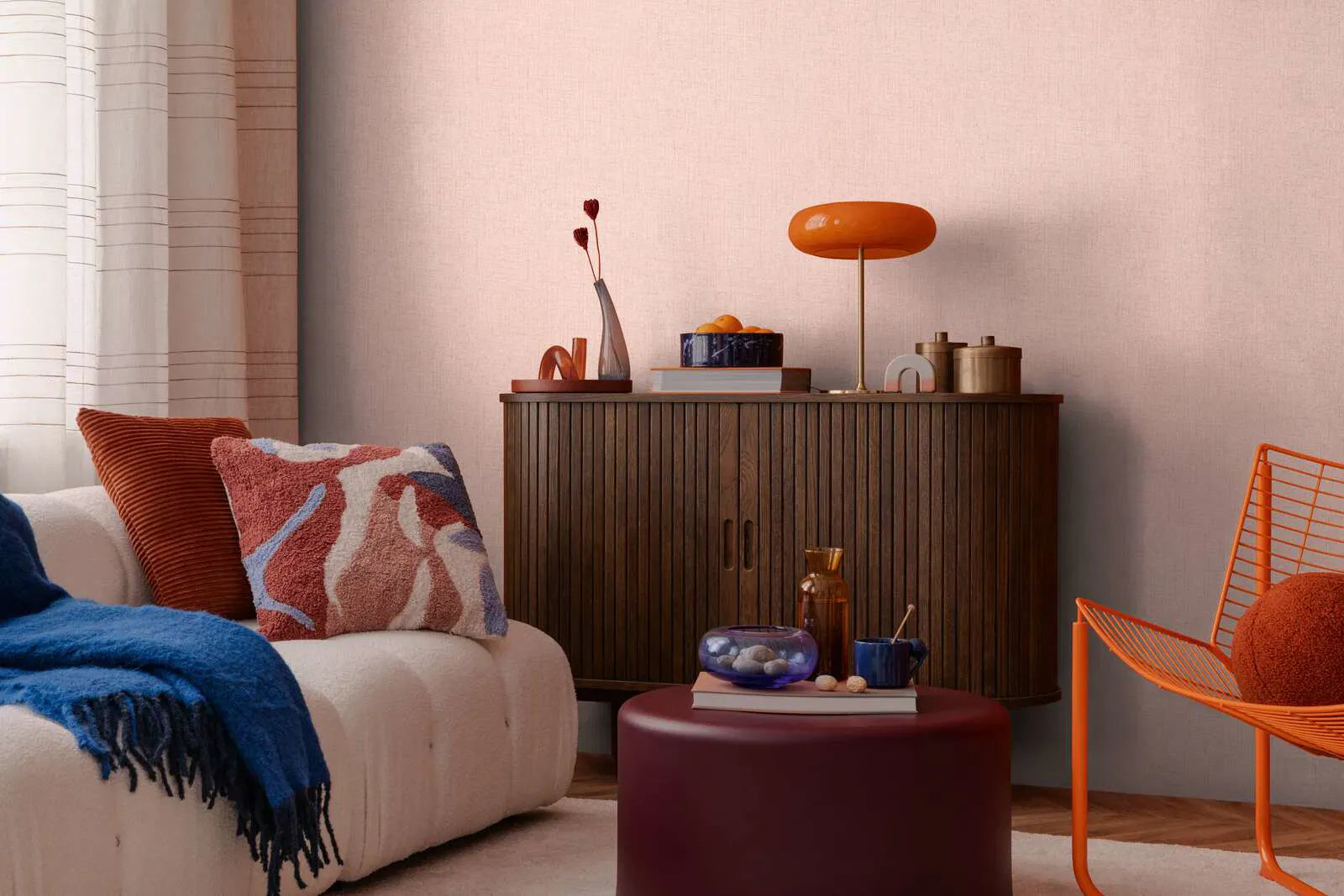 Delikāts, teksturēts raksts maigā rozā tonī, kas atgādina smalku lina audumu. Virsmai ir smalka, krustveida līniju struktūra, kas materiālam piešķir tekstila izskatu. Krāsu gamā dominē pūderveida rozā un smilškrāsas toņi ar smalkiem, gaišiem akcentiem, kas kopumā piešķir siltu un draudzīgu izskatu. Efekts ir nomierinošs, maigs un mājīgs, un tas ir ideāls kā neuzkrītošs, bet stilīgs fons, kas maigi izgaismo telpas un rada mājīgu atmosfēru.