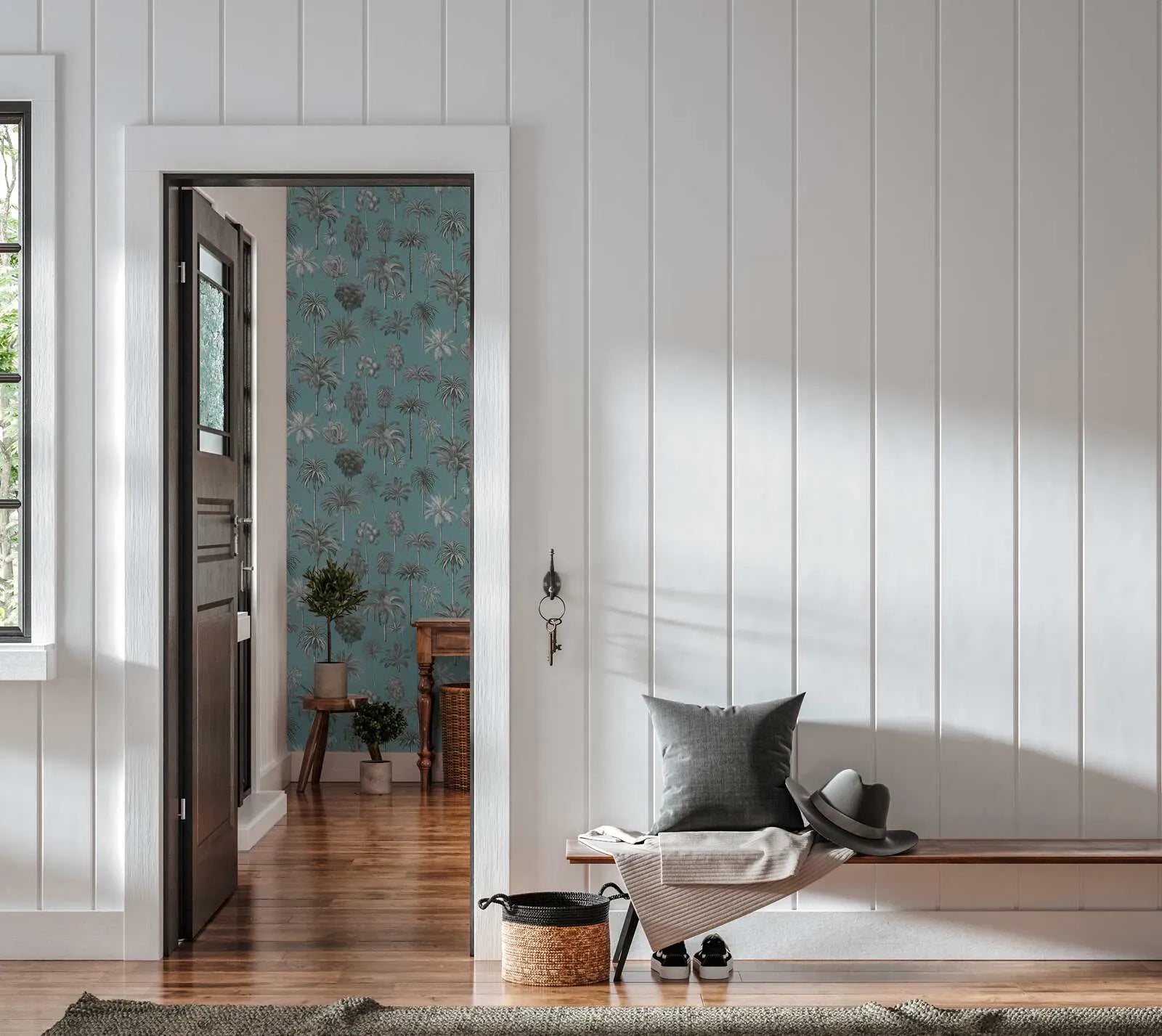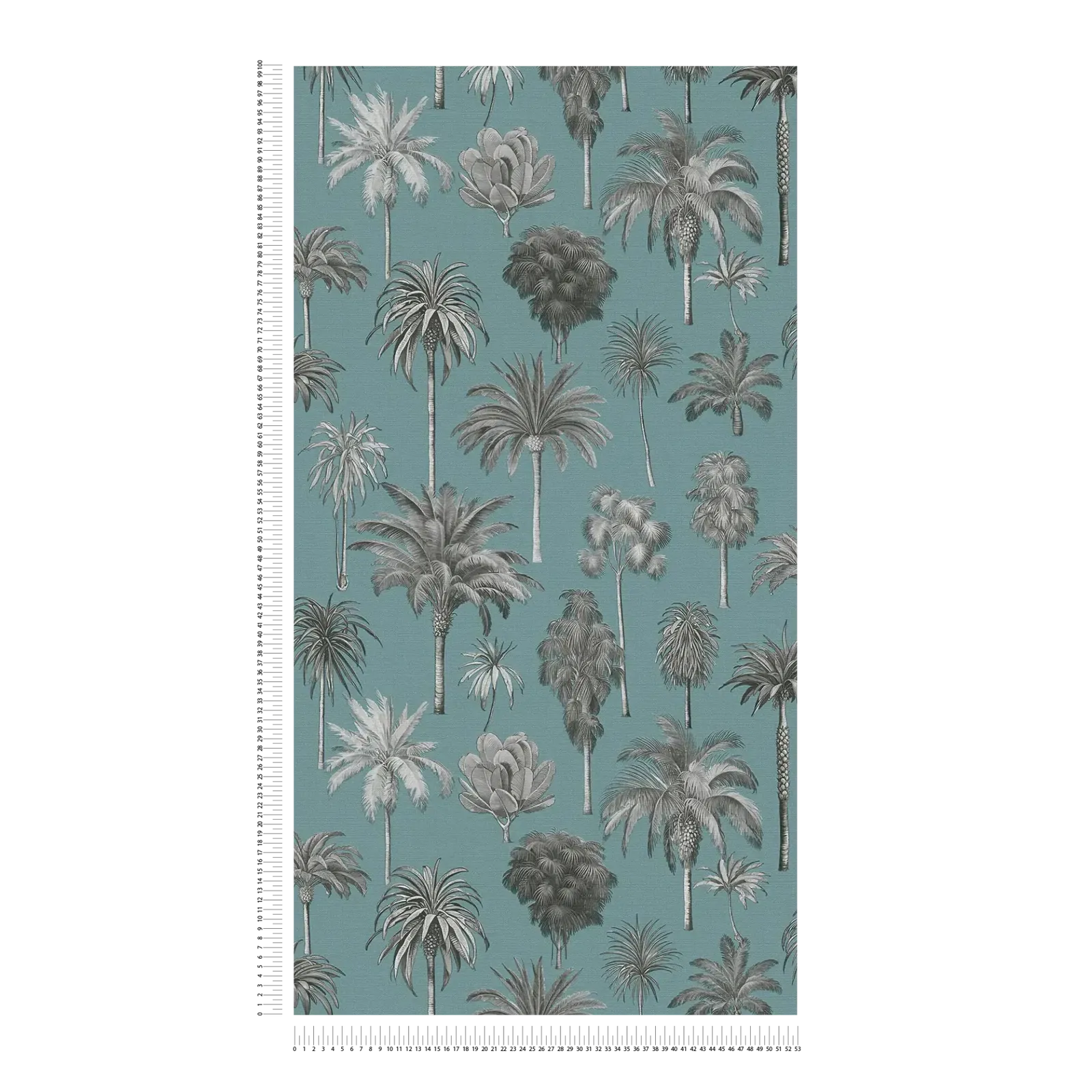 Troopilise disainiga tapeet stiilse palmipuudega, kerge tekstuuriga ja mattviimistlusega - sinine - 3012242
