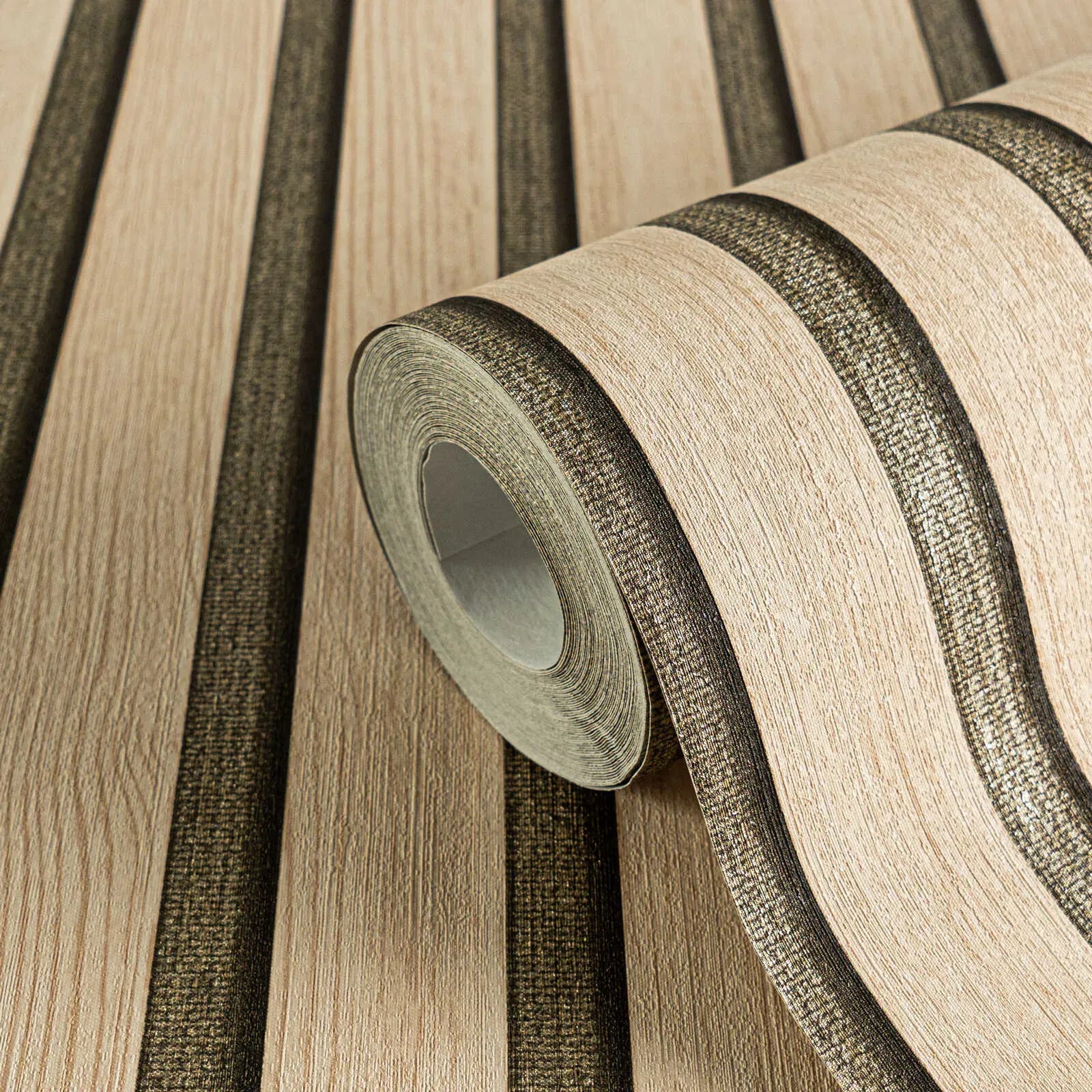 Triibuline tapeet puiduimitatsiooniga beežis, kergelt läikiv pind - 3000333