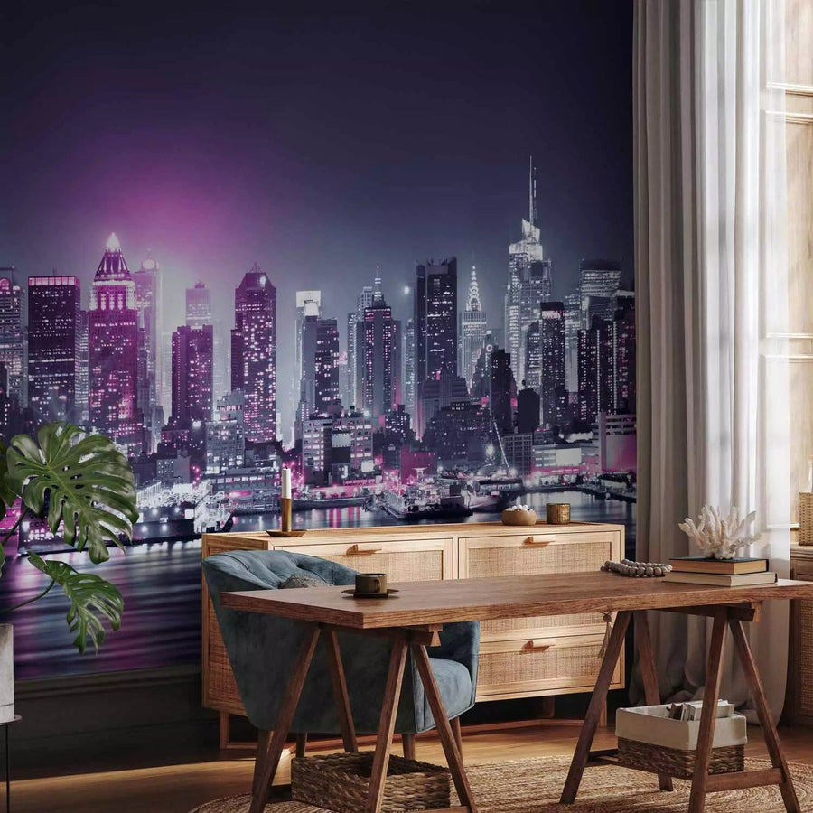 Valokuvatapetti Manhattanin valaistu yösatama violetin sävyissä, 87859